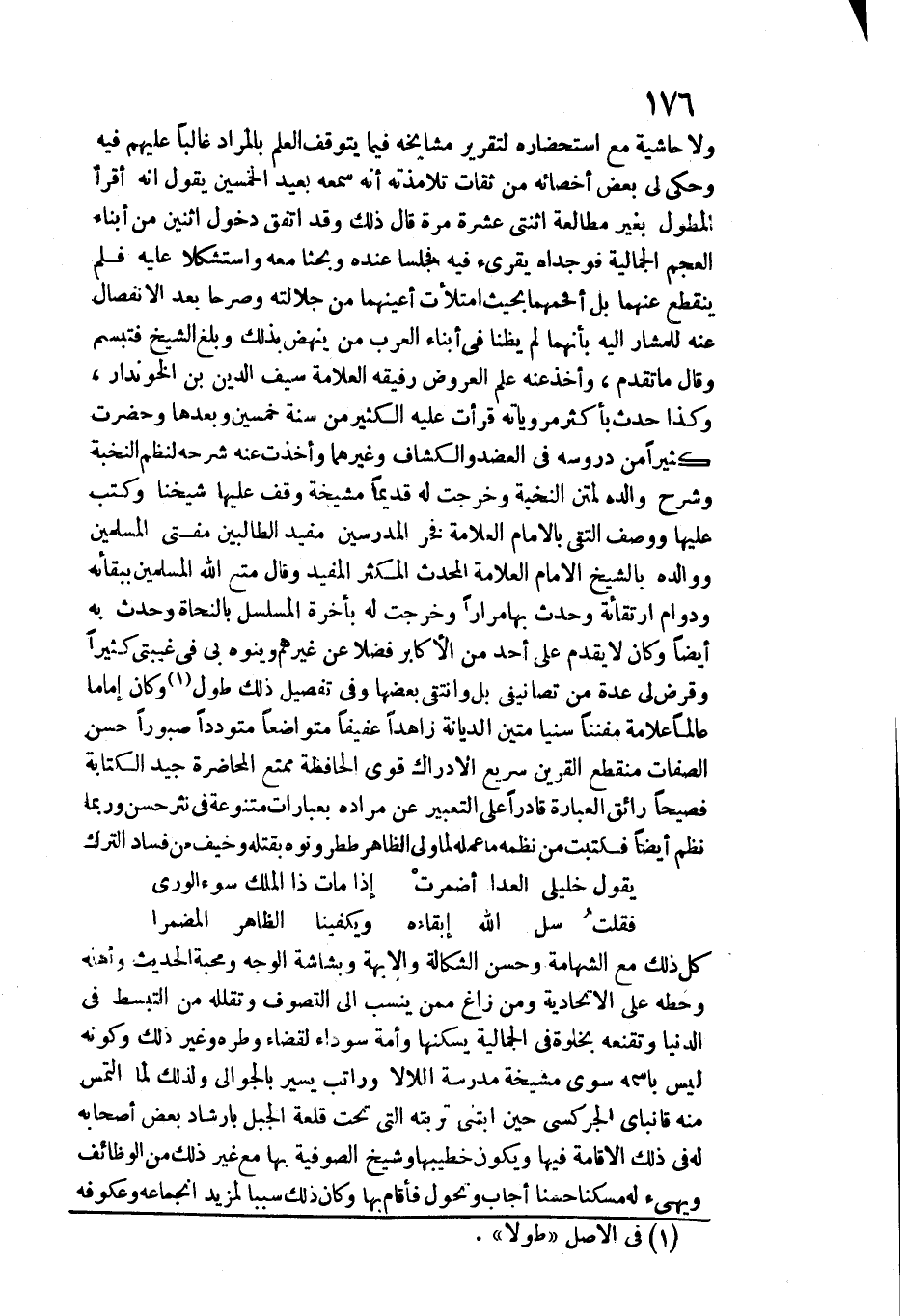 وَلَا حَاشِيَة مَعَ استحضاره لتقرير مشايخه فِيمَا يتَوَقَّف الْعلم بالمراد غَالِبا عَلَيْهِم يه وَحكى لي بعض أخصائه من ثِقَات تلامذته أَنه سَمعه بعيد الْخمسين يَقُول أَنه أَقرَأ المطول بِغَيْر مطالعة اثْنَتَيْ عشرَة مرّة قَالَ ذَلِك وَقد اتّفق دُخُول اثْنَيْنِ من أَبنَاء الْعَجم الجمالية فوجداه يقرئ فِيهِ فَجَلَسَا عِنْده وبحثا مَعَه واستشكلا عَلَيْهِ فَلم يَنْقَطِع عَنْهُمَا بل افحمهما بِحَيْثُ امْتَلَأت أعينهما من جلالته وصرحا بعد الِانْفِصَال عَنهُ للمشار إِلَيْهِ بِأَنَّهُمَا لم يظنا فِي أَبنَاء الْعَرَب من ينْهض بذلك وَبلغ الشَّيْخ فَتَبَسَّمَ وَقَالَ مَا تقدم، وَأخذ عَنهُ علم الْعرُوض رَفِيقه الْعَلامَة سيف الدّين)