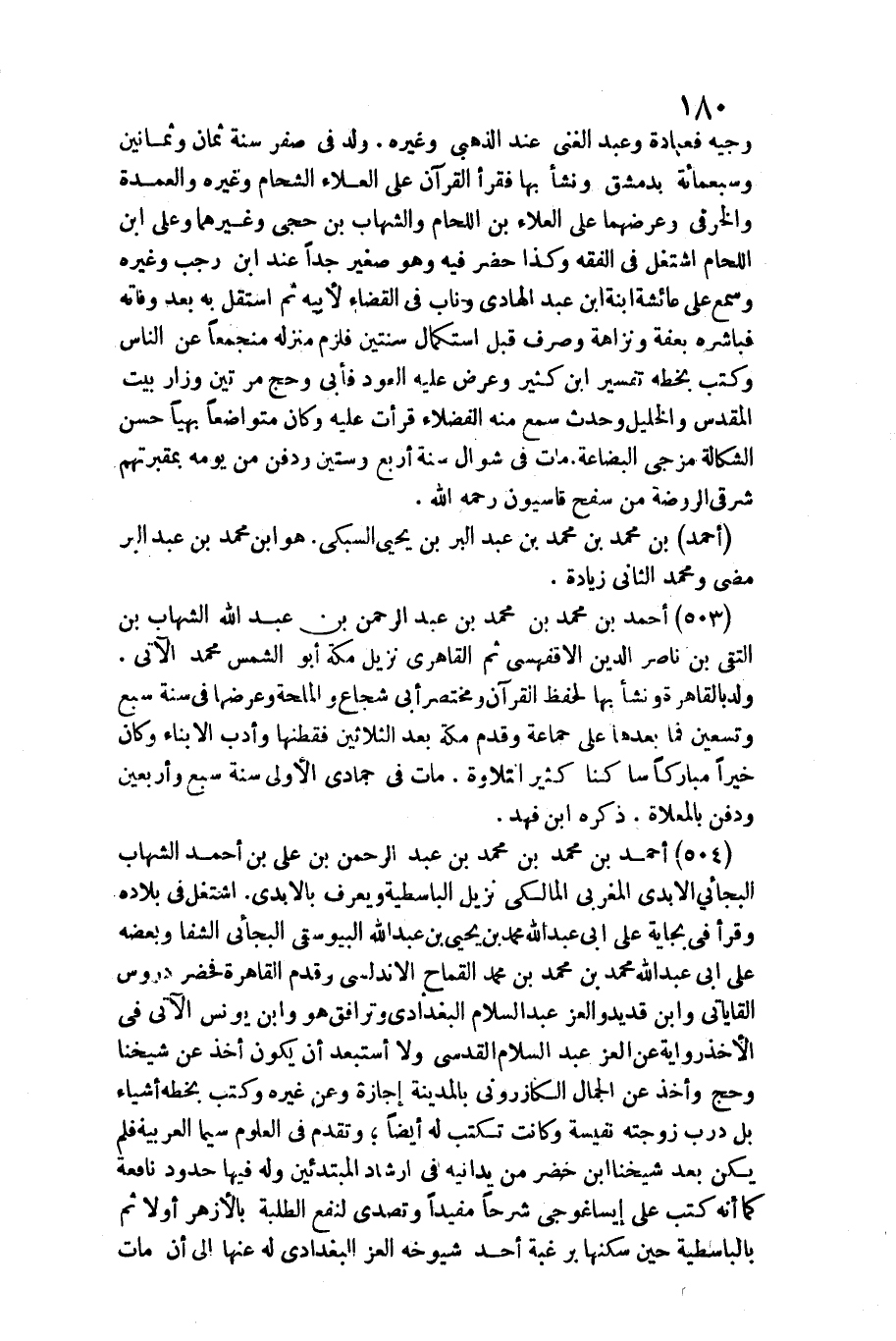504 - أَحْمد بن مُحَمَّد بن مُحَمَّد بن عبد الرَّحْمَن بن عَليّ بن أَحْمد الشهَاب البجائي الأبدي المغربي الْمَالِكِي نزيل الباسطية وَيعرف بالآبدي. / اشْتغل فِي بِلَاده وَقَرَأَ فِي بجاية على أبي عبد الله مُحَمَّد بن يحيى بن عبد الله البيوسقي البجائي الشفا وَبَعضه على أبي عبد الله مُحَمَّد بن مُحَمَّد بن مُحَمَّد القماح الأندلسي وَقدم الْقَاهِرَة فَحَضَرَ دروس القاياتي وَابْن قديد والعز عبد السَّلَام الْبَغْدَادِيّ وترافق هُوَ وَابْن يُونُس الْآتِي فِي الْأَخْذ رِوَايَة عَن الْعِزّ عبد السَّلَام الْقُدسِي وَلَا أستبعد أَن يكون أَخذ عَن شَيخنَا وَحج وَأخذ عَن الْجمال الكازورني بِالْمَدِينَةِ إجَازَة وَعَن غَيره وَكتب بِخَطِّهِ أَشْيَاء بل درب زَوجته نفيسة وَكَانَت تكْتب لَهُ أَيْضا وَتقدم فِي الْعُلُوم سِيمَا الْعَرَبيَّة فَلم يكن بعد شَيخنَا ابْن خضر من يدانيه فِي إرشاد المبتدئين وَله فِيهَا حُدُود نافعة كَمَا أَنه كتب على إيساغوجي شرحا مُفِيدا وتصدى لنفع الطّلبَة بالأزهر أَولا ثمَّ بالباسطية حِين سكنها برغبة أحد شُيُوخه الْعِزّ الْبَغْدَادِيّ لَهُ عَنْهَا إِلَى أَن مَاتَ