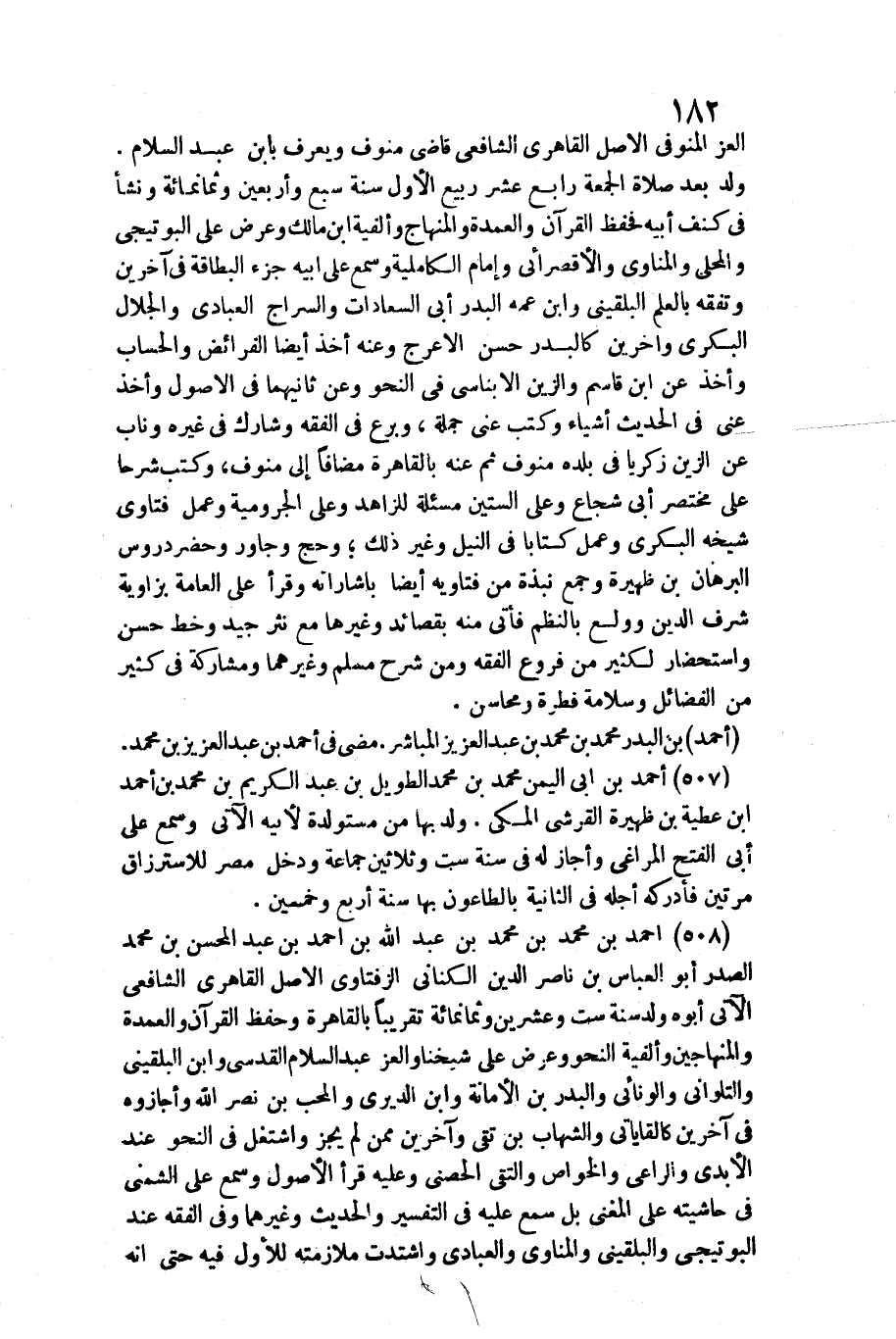 وألفية ابْن مَالك وَعرض على البوتيجي والمحلي والمناوي والأقصرائي وَإِمَام الكاملية وَسمع على أَبِيه جُزْء البطاقة فِي آخَرين وتفقه بِالْعلمِ البُلْقِينِيّ وَابْن عَمه الْبَدْر أبي السعادات والسراج الْعَبَّادِيّ والجلال الْبكْرِيّ وَآخَرين كالبدر حسن الْأَعْرَج وَعنهُ أَخذ أَيْضا الْفَرَائِض والحساب وَأخذ عَن ابْن قَاسم والزين الأبناسي فِي النَّحْو وَعَن ثَانِيهمَا فِي الْأُصُول وَأخذ عني فِي الحَدِيث أَشْيَاء وَكتب عني جملَة، وبرع فِي الْفِقْه وشارك فِي غَيره وناب عَن الزين زَكَرِيَّا فِي بَلَده منوف ثمَّ عَنهُ بِالْقَاهِرَةِ مُضَافا إِلَى منوف، وَكتب شرحا على مُخْتَصر أبي شُجَاع وعَلى السِّتين مسئلة للزاهد وعَلى الجرومية وَعمل فَتَاوَى شَيْخه الْبكْرِيّ وَعمل كتابا فِي النّيل وَغير ذَلِك وَحج وجاور وَحضر دروس الْبُرْهَان بن ظهيرة وَجمع نبذة من فَتَاوِيهِ أَيْضا بإشاراته وَقَرَأَ على الْعَامَّة بزاوية شرف الدّين وولع بالنظم فَأتى مِنْهُ بقصائد وَغَيرهَا مَعَ نثر جيد وَخط حسن واستحضار لكثير من فروع الْفِقْه وَمن شرح مُسلم وَغَيرهمَا ومشاركة فِي كثير من الْفَضَائِل وسلامة فطْرَة ومحاسن.