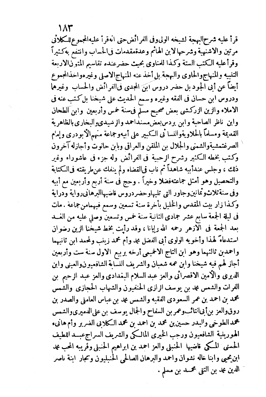 الْبَهْجَة لشيخه الْوَلِيّ وَفِي الْفَرَائِض حَتَّى أَنه قَرَأَ عَلَيْهِ الْمَجْمُوع للكلائي مرَّتَيْنِ والأشنهية وَشَرحهَا لِابْنِ الهائم وعدة مُقَدمَات فِي الْحساب وانتفع بِهِ كثيرا وَقَرَأَ عَلَيْهِ الْكتب السِّتَّة وَكَذَا للمناوي بِحَيْثُ حضر عِنْده تقاسيم الْمُتُون الْأَرْبَعَة التَّنْبِيه والمنهاج وَالْحَاوِي والبهجة بل أَخذ عَنهُ الْمِنْهَاج الْأَصْلِيّ وَغَيره وَأخذ الْمَجْمُوع أَيْضا عَن أبي الْجُود بل حضر دروس ابْن المجدي فِي الْفَرَائِض والحساب وَغَيرهمَا ودروس ابْن حسان فِي الْفِقْه وَغَيره وَسمع الحَدِيث على شَيخنَا بل كتب عَنهُ فِي الْإِمْلَاء والزين الزَّرْكَشِيّ بعض صَحِيح مُسلم فِي سنة خمس وَأَرْبَعين وَابْن الطَّحَّان وَابْن نَاظر الصاحبة وَابْن بردس بعض مُسْند أَحْمد والرشيدي وَالْبُخَارِيّ بالظاهرية الْقَدِيمَة وَمُسلمًا بالحلاوية وَالنَّسَائِيّ الْكَبِير على أَبِيه وَجَمَاعَة مِنْهُم الأبودري وَإِمَام الصرغتمشية والشمني والجلال بن الملقن والعراقي وبابن حَانُوت وَأَجَازَ لَهُ آخَرُونَ وَكتب بِخَطِّهِ الْكثير وَشرح الرحبية فِي الْفَرَائِض وَله جُزْء فِي عَاشُورَاء وَغير ذَلِك، وَجلسَ عِنْد أيبه شَاهدا ثمَّ نَاب فِي الْقَضَاء وَلم يَنْفَكّ عَن طَرِيقَته فِي الْكِتَابَة والتحصيل وَهُوَ أمثل جماعته فضلا وَخيرا. وَحج فِي سنة أَربع وَأَرْبَعين مَعَ أَبِيه وَفِي سنة ثَلَاث وَثَمَانِينَ وجاور الَّتِي تَلِيهَا وَحضر دروس قاضيها البرهاني راوية ودراية وَكَذَا زار بَيت الْمُقَدّس والخليل بِأخرَة سنة تسعين وَسمع فيهمَا من جمَاعَة. مَاتَ فِي لَيْلَة الْجُمُعَة سَابِع عشر جُمَادَى الثَّانِيَة سنة خمس وَتِسْعين وَصلي عَلَيْهِ من الْغَد بعد الْجُمُعَة فِي الْأَزْهَر رَحمَه الله وإيانا، وَقد رَأَيْت بِخَط شَيخنَا الزين رضوَان استدعاء لهَذَا وأخويه الولوي أبي الْفضل مُحَمَّد وَأم مُحَمَّد زَيْنَب ولمحمد ابْن ثَانِيهمَا وَأحمد بن ثالثهما وَهُوَ ابْن التَّاج الأخميمي أرخه بربيع الأول سنة سِتّ وَأَرْبَعين أجَاز لَهُم فِيهِ شَيخنَا وَابْن عَمه شعْبَان والشريف النسابة الشافعيون والعيني وَابْن الديري والأمين الأقصرائي والعز عبد السَّلَام الْبَغْدَادِيّ والعز عبد الرَّحِيم بن الْفُرَات وَالشَّمْس مُحَمَّد بن يُوسُف الرَّازِيّ الحنفيون والشهاب الْحِجَازِي وَالشَّمْس مُحَمَّد بن أَحْمد بن عمر السعودي الْفَقِيه وَالشَّمْس مُحَمَّد بن عَبَّاس العاملي والصدر بن روق والعز بن أبي التائب وَعمر بن السفاح وَالْجمال يُوسُف بن عَليّ الدَّمِيرِيّ وَالشَّمْس مُحَمَّد الطوخي والبدر حُسَيْن بن مُحَمَّد بن أَحْمد بن مُحَمَّد الْكلابِي الضَّرِير وَأم هَانِئ الهورينية الشافعيون وَرَجَب الخيري الْمَالِكِي والشريف السراج عبد اللَّطِيف الحسني الْمَكِّيّ قاضيها الْحَنْبَلِيّ والعز أَحْمد بن إِبْرَاهِيم الْحَنْبَلِيّ وقريبه الْمُحب مُحَمَّد بن يحيى وابنا خَاله نشوان وَأحمد والبرهان الصَّالِحِي الحنبليون وتجار ابْنة نَاصِر الدّين مُحَمَّد بن التقي)
