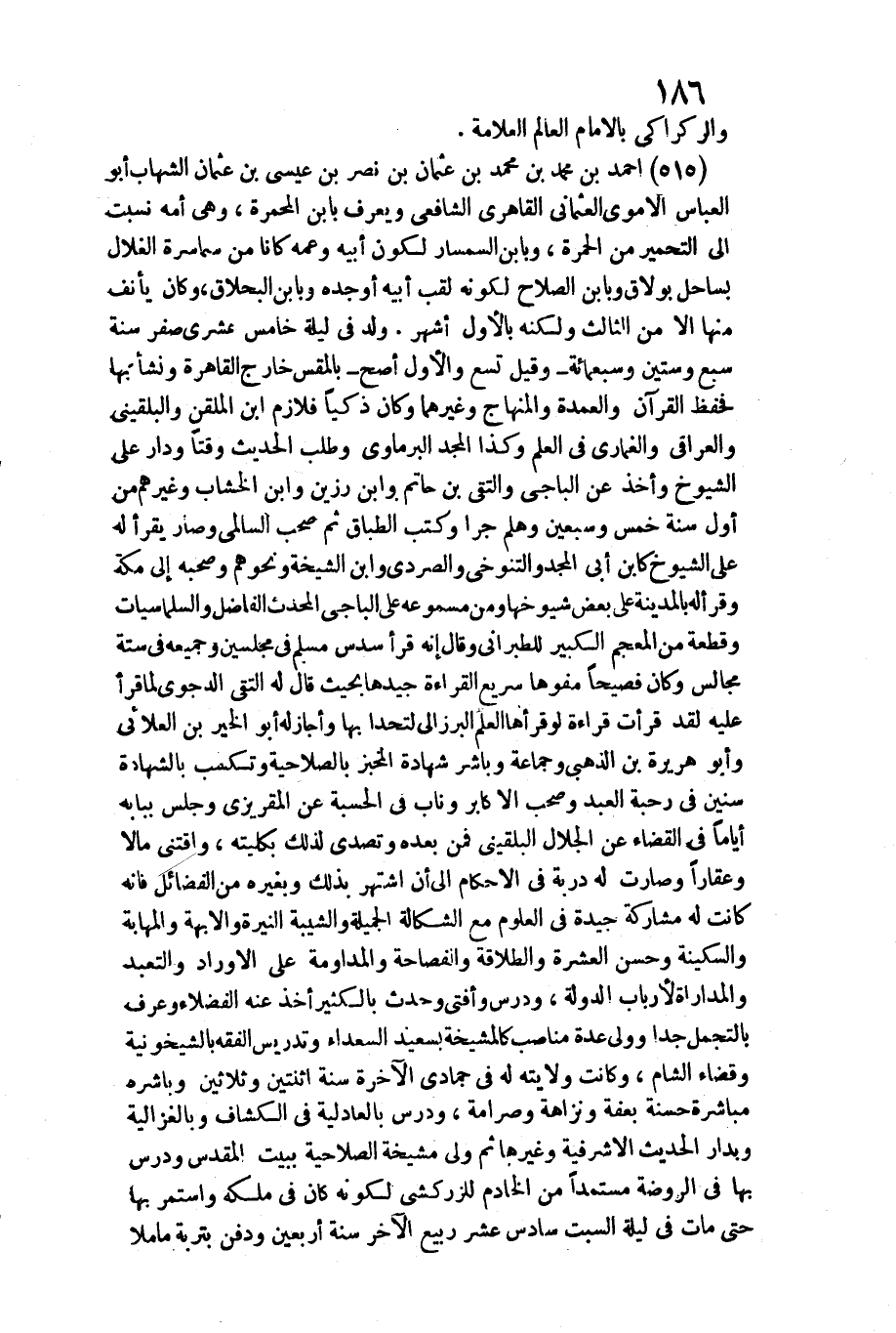 515 - أَحْمد بن مُحَمَّد بن مُحَمَّد بن عُثْمَان بن نصر بن عِيسَى بن عُثْمَان الشهَاب أَبُو الْعَبَّاس الْأمَوِي العثماني القاهري الشَّافِعِي وَيعرف بِابْن المحمرة، وَهِي أمه نسبت إِلَى التحمير من الْحمرَة، وبابن السمسار لكَون أَبِيه وَعَمه كَانَا من سماسرة الغلال بساحل بولاق وبابن الصّلاح لكَونه لقب أَبِيه أَو جده وبابن البحلاق، / وَكَانَ يأنف مِنْهَا إِلَّا من الثَّالِث وَلكنه بِالْأولِ أشهر. ولد فِي لَيْلَة خَامِس عشري صفر سنة سبع وَسِتِّينَ وَسَبْعمائة وَقيل تسع وَالْأول أصح بالمقس خَارج الْقَاهِرَة وَنَشَأ بهَا فحفظ الْقُرْآن والعمدة والمنهاج وَغَيرهمَا وَكَانَ ذكيا فلازم ابْن الملقن والبلقيني والعراقي والغماري فِي الْعلم وَكَذَا الْمجد الْبرمَاوِيّ وَطلب الحَدِيث وقتا وَدَار على الشُّيُوخ وَأخذ عَن الْبَاجِيّ والتقي بن حَاتِم وَابْن رزين وَابْن الخشاب وَغَيرهم من أول سنة خمس وَسبعين وهلم جرا وَكتب الطباق ثمَّ صحب السالمي وَصَارَ يقْرَأ لَهُ على الشُّيُوخ كَابْن أبي الْمجد والتنوخي والصردي وَابْن الشيخة وَنَحْوهم وَصَحبه إِلَى مَكَّة وَقَرَأَ لَهُ بِالْمَدِينَةِ على بعض شيوخها وَمن مسموعه على الْبَاجِيّ الْمُحدث الْفَاضِل والسلماسيات وَقطعَة من المعجم الْكَبِير للطبراني وَقَالَ إِنَّه قَرَأَ سدس مُسلم فِي مجلسين وجميعه فِي سِتَّة مجَالِس وَكَانَ فصيحا مفوها سريع الْقِرَاءَة جيدها بِحَيْثُ قَالَ لَهُ التقي الدجوي لما قَرَأَ عَلَيْهِ لقد قَرَأت قِرَاءَة لَو قَرَأَهَا الْعلم البرزالي لتحدا بهَا وَأَجَازَ لَهُ أَبُو الْخَيْر بن العلائي وَأَبُو هُرَيْرَة بن الذَّهَبِيّ وَجَمَاعَة وباشر شَهَادَة المخبز بالصلاحية وتكسب بِالشَّهَادَةِ سِنِين فِي رحبة العَبْد وَصَحب الأكابر وناب فِي الْحِسْبَة عَن المقريزي وَجلسَ بِبَابِهِ أَيَّامًا فِي الْقَضَاء عَن الْجلَال البُلْقِينِيّ فَمن بعده وتصدى لذَلِك بكليته، واقتنى مَالا وعقارا وَصَارَت لَهُ دربة فِي الْأَحْكَام إِلَى أَن اشْتهر بذلك وَبِغَيْرِهِ من الْفَضَائِل فَإِنَّهُ كَانَت لَهُ مُشَاركَة جَيِّدَة فِي الْعُلُوم مَعَ الشكالة الجميلة والشيبة النيرة والأبهة)