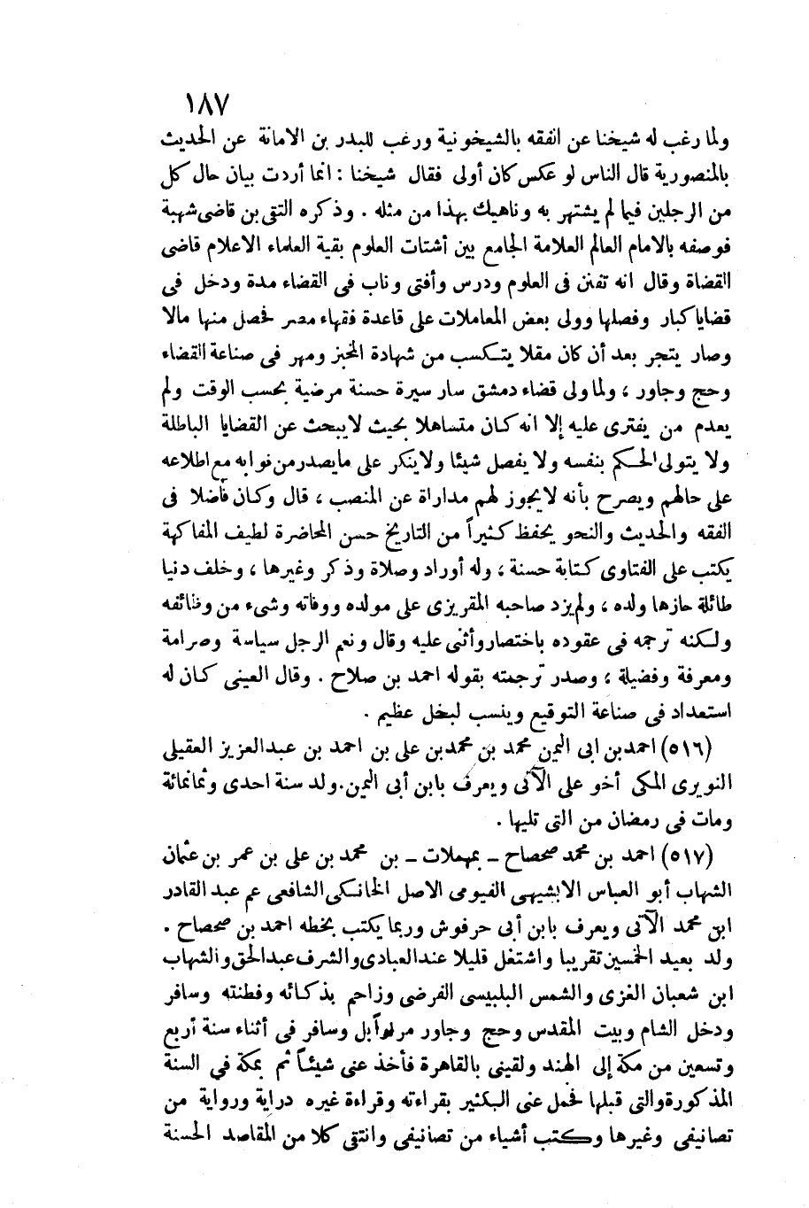 517 - أَحْمد بن مُحَمَّد صحصاح بمهملات بن مُحَمَّد بن عَليّ بن عمر بن عُثْمَان الشهَاب أَبُو الْعَبَّاس الأبشيهي الفيومي الأَصْل الخانكي الشَّافِعِي عَم عبد الْقَادِر بن مُحَمَّد الْآتِي وَيعرف بِابْن أبي حرفوش / وَرُبمَا يكْتب بِخَطِّهِ أَحْمد بن صحصاح. ولد بعيد الْخمسين تَقْرِيبًا واشتغل قَلِيلا عِنْد الْعَبَّادِيّ والشرف عبد الْحق والشهاب بن شعْبَان الْغَزِّي وَالشَّمْس البلبيسي الفرضي وزاحم بذكائه وفطنته وسافر وَدخل الشَّام وَبَيت الْمُقَدّس وَحج وجاور مرَارًا بل وسافر فِي أثْنَاء سنة أَربع وَتِسْعين من مَكَّة إِلَى الْهِنْد ولقيني بِالْقَاهِرَةِ فَأخذ عني شَيْئا ثمَّ بِمَكَّة فِي السّنة الْمَذْكُورَة وَالَّتِي قبلهَا فَحمل عني الْكثير بقرَاءَته وَقِرَاءَة غَيره دراية وَرِوَايَة من تصانيفي وَغَيرهَا وَكتب أَشْيَاء من تصانيفي وانتقى كلا من الْمَقَاصِد الْحَسَنَة