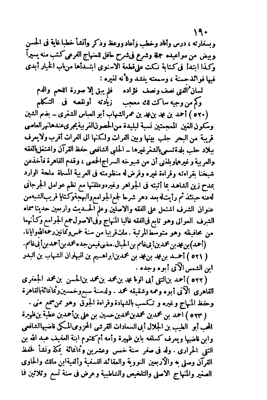520 - أَحْمد بن مُحَمَّد بن مُحَمَّد بن عمر الشهَاب أَبُو الْعَبَّاس الشغري بِضَم الشين وَسُكُون الْغَيْن المعجمتين / نِسْبَة لبليدة من الْحُصُون الغربية يجْرِي عِنْدهَا نهر العَاصِي قريبَة من الْبَحْر حلب بَينهَا وَبَين الْفُرَات وَلكنهَا إِلَى الْفُرَات أقرب وَلَا يعرف بِبِلَاد حلب بَلْدَة تسمى بالشغر غَيرهَا الْحلَبِي الشَّافِعِي حفظ الْقُرْآن واشتغل بالفقه والعربية وَغَيرهمَا وَبَلغنِي أَن من شُيُوخه السراج الْحِمصِي، وَقدم الْقَاهِرَة فَأخذ عَن شَيخنَا بقرَاءَته وَقِرَاءَة غَيره وقرض لَهُ منظومته فِي الْعَرَبيَّة الْمُسَمَّاة ملحة الْوَارِد بمدح زين الشَّاهِد بِمَا أثْبته فِي الْجَوَاهِر وَغَيره وعلقتها مَعَ نظم عوامل الْجِرْجَانِيّ لَهُ عَنهُ حِينَئِذٍ ثمَّ رَأَيْت لَهُ بعد دهر شرحا لجمع الْجَوَامِع والبهجة وكتابا قريب الشّبَه من عنوان الشّرف اشْتَمَل على الْفِقْه والأصلين وَعلم الحَدِيث وأربيعن حَدِيثا سَمَّاهُ الشّرف العوالي وَهُوَ تَابع فِي الْفِقْه غَالِبا الْمِنْهَاج وَفِي الْأُصُول جمع الْجَوَامِع وكأنهما من محافيظه وَهُوَ متوط الْمرتبَة. مَاتَ قَرِيبا من سنة خمس وَثَمَانِينَ رَحمَه الله وإيانا.