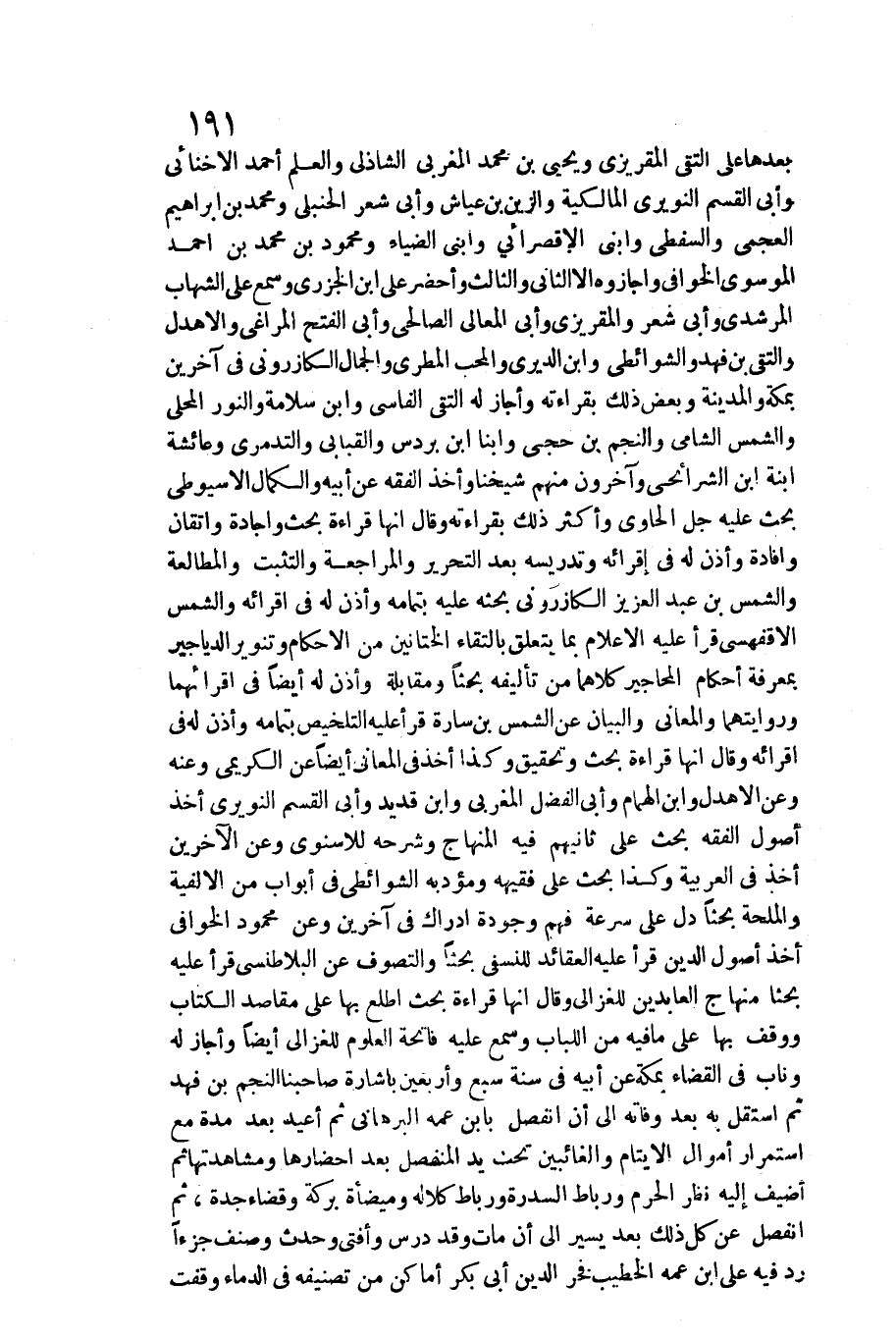 بعْدهَا على التقي المقريزي وَيحيى بن مُحَمَّد المغربي الشاذلي وَالْعلم أَحْمد الأخنائي وَأبي الْقسم النويري الْمَالِكِيَّة والزين بن عَيَّاش وَأبي شعر الْحَنْبَلِيّ وَمُحَمّد بن إِبْرَاهِيم العجمي والسفطي وَابْني الأقصرائي وَابْني الضياء ومحمود بن مُحَمَّد بن أَحْمد الموسوي الخوافي وأجازوه إِلَّا الثَّانِي وَالثَّالِث وأحضر على ابْن الْجَزرِي وَسمع على الشهَاب المرشدي وَأبي شعر والمقريزي وَأبي الْمَعَالِي الصَّالِحِي وَأبي الْفَتْح المراغي والأهدل والتقي بن فَهد والشوائطي وَابْن الديري والمحب المطري وَالْجمال الكازروني فِي آخَرين بِمَكَّة وَالْمَدينَة وَبَعض ذَلِك بقرَاءَته وَأَجَازَ لَهُ التقي الفاسي وَابْن سَلامَة والنور الْمحلي وَالشَّمْس الشَّامي والنجم بن حجي وابنا ابْن بردس والقبابي والتدمري وَعَائِشَة ابْنة ابْن الشرائحي وَآخَرُونَ مِنْهُم شَيخنَا وَأخذ الْفِقْه عَن أَبِيه والكمال الأسيوطي بِحَيْثُ عَلَيْهِ جلّ الْحَاوِي وَأكْثر ذَلِك بقرَاءَته وَقَالَ أَنَّهَا قِرَاءَة بحث وإجادة وإتقان وإفادة وَأذن لَهُ فِي إقرائه وتدريسه بعد التَّحْرِير والمراجعة والتثبت والمطالعة وَالشَّمْس بن عبد الْعَزِيز الكازروني بَحثه عَلَيْهِ بِتَمَامِهِ وَأذن لَهُ فِي إقرائه وَالشَّمْس الأقفهسي قَرَأَ عَلَيْهِ الْأَعْلَام بِمَا يتَعَلَّق بالتقاء الختانين من الْأَحْكَام وتنوير الدياجير بِمَعْرِِفَة أَحْكَام المحاجير كِلَاهُمَا من تأليفه بحثا ومقابلة وَأذن لَهُ أَيْضا فِي إقرائهما وروايتهما والمعاني وَالْبَيَان عَن الشَّمْس بن سارة قَرَأَ عَلَيْهِ التَّلْخِيص بِتَمَامِهِ)