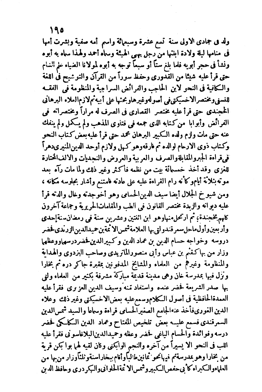 الصّرْف لَهُ مرَارًا ومختصراته فِي الْفَرَائِض وأبوابا من كِتَابه الَّذِي جمعه فِي فتاوي الْمَذْهَب وَلم يكمل وَلم يَنْفَكّ عَنهُ حَتَّى مَال وَلزِمَ وَلَده الْكَبِير الْبُرْهَان مُحَمَّد حَتَّى قَرَأَ عَلَيْهِ بعض كتاب النَّحْو وَكتاب ذَوي الْأَرْحَام لوالده ثمَّ فَارقه وَهُوَ كهل ولازم أوحد الدّين المنيري دهرا فِي قِرَاءَة الْجَبْر والمقابلة وَالصرْف والعربية وَالْعرُوض والنجديات وَالْألف المختارة للغزي وَقد أَخذ خَمْسمِائَة بَيت من نظمه فَأكْثر وَغير ذَلِك وَلما مَاتَ رَآهُ بعد مَوته بِثَلَاثَة أَيَّام وَكَأَنَّهُ رام الْقِرَاءَة عَلَيْهِ على عَادَته فَامْتنعَ وَأَشَارَ بجلوسه مَكَانَهُ، وَمن شُيُوخ الْجلَال أَيْضا سيف الدّين الحسامي وَهُوَ أَخُو جدته وخال والدته قَرَأَ عَلَيْهِ ديوانه والزبدة مُخْتَصر القانون فِي الطِّبّ والمقامات الحريرية وَجَمَاعَة آخَرُونَ كلهم بخجندة ثمَّ ارتحل مِنْهَا وَهُوَ ابْن اثْنَتَيْنِ وَعشْرين سنة فِي رَمَضَان سنة إِحْدَى وَأَرْبَعين وَأول مَا حل سَمَرْقَنْد وَلَقي بهَا الْعَلامَة شمس الْأَئِمَّة بن حميد الدّين الزرندي فَحَضَرَ دروسه وخواجه حسام الدّين بن عماد الدّين وكبير الدّين فَحَضَرَ درسهما ووعظهما وزار من بهَا كقثم بن عَبَّاس وَأبي مَنْصُور الماتريدي وَصَاحب الْبَزْدَوِيّ وَالْهِدَايَة والمنظومة وَغَيرهم من الْعلمَاء والمشايخ المدفونين بمقبرة جاكردره ثمَّ بخارا وَنزل فِيهَا بمدرسة خَان وَهِي مَدِينَة قديمَة مباركة مشرفة بِكَثِير من الْعلمَاء وَلَقي بهَا صدر الشَّرِيعَة فَحَضَرَ عِنْده واستفاد مِنْهُ وَسيف الدّين العزيري فَقَرَأَ عَلَيْهِ الْعُمْدَة الحافظية فِي أصُول الْكَلَام وَسمع عَلَيْهِ بعض الأخسيكتي وَغير ذَلِك وعلاه الدّين الغوري فَأخذ عَنهُ الْجَامِع الصَّغِير الحسامي قِرَاءَة وسماعا وَالسَّيِّد شمس الدّين السَّمرقَنْدِي فَسمع عَلَيْهِ بعض تَلْخِيص الْمِفْتَاح وعماد الدّين الكلكي فَحَضَرَ درسه وفوائده والحسام الياغي فَحَضَرَ وعظه وَحميد الدّين البلاغاسوني فَقَرَأَ عَلَيْهِ اللب فِي النَّحْو إِلَّا يَسِيرا من آخِره والنجم الوابكني وَكَانَ لقِيه لَهما بوابكن قَرْيَة من بخارا وَهُوَ بمدرسة ثمَّ فِيهَا نَحْو ثَمَانِينَ طَالبا وَأقَام ببخارا سنة وَثلثا وزار من بهَا من الْعلمَاء والكبراء كَأبي حَفْص الْكَبِير وشمس الْأَئِمَّة الْحلْوانِي والكردري وحافظ الدّين
