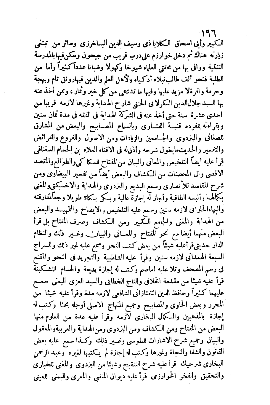 الْكَبِير وَأبي إِسْحَاق الكلاباذي وَسيف الدّين الباخرزي وَسَائِر من تبتغي زيارته هُنَاكَ ثمَّ دخل خوارزم على درب قريب من جيحون وَسكن فِيهَا بِالْمَدْرَسَةِ التنكية ووافى بهَا من محققي الْعلمَاء شُيُوخًا وكهولا وشبانا عددا كثيرا وَأما من الطّلبَة فنحو ألف طَالب نبلاء أذكياء وَلأَهل الْعلم وَالدّين فِيهَا رونق تَامّ وبهجة وَحُرْمَة وافرة لَا مزِيد عَلَيْهَا وفيهَا مَا تشْتَهي من كل خير وثمار، وَمِمَّنْ أَخذ عَنهُ بهَا السَّيِّد جلال الدّين الكرلابي الْحَنَفِيّ شَارِح الْهِدَايَة وَغَيرهَا لَازمه)