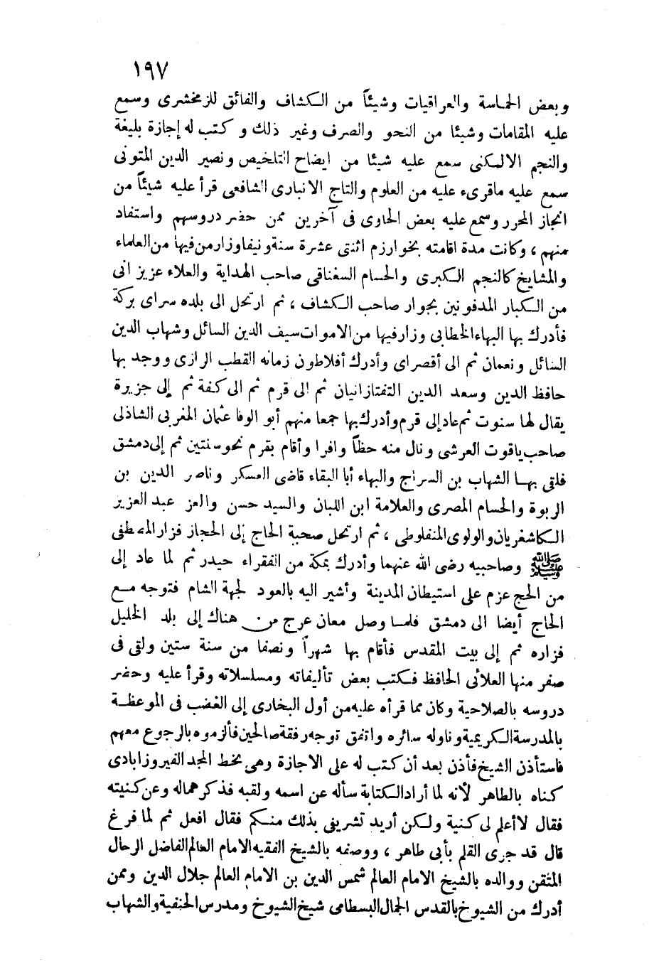 والْعَلَاء عزيزاني من الْكِبَار المدفونين بجوار صَاحب الْكَشَّاف، ثمَّ ارتحل إِلَى بَلَده سراي بركَة فَأدْرك بهَا الْبَهَاء الْخطابِيّ وزار فِيهَا من الْأَمْوَات سيف الدّين السَّائِل وشهاب الدّين السَّائِل ونعمان ثمَّ إِلَى أقصراي وَأدْركَ أفلاطون زَمَانه القطب الرَّازِيّ وجد بهَا حَافظ الدّين وَسعد الدّين التفتازانيات ثمَّ إِلَى قرم ثمَّ إِلَى كفة ثمَّ إِلَى جَزِيرَة يُقَال لَهَا سنوت ثمَّ عَاد إِلَى قرم وَأدْركَ بهَا جمعا مِنْهُم أَبُو الوفا عُثْمَان المغربي الشاذلي صَاحب ياقوت العرشي ونال مِنْهُ حظا وافرا وَأقَام بقرم نَحْو سنتَيْن ثمَّ إِلَى دمشق فلقي بهَا الشهَاب بن السراج والبهاء أَبَا الْبَقَاء قَاضِي الْعَسْكَر وناصر الدّين بن الربوة والحسام الْمصْرِيّ والعلامة ابْن اللبان وَالسَّيِّد حسن والعز عبد الْعَزِيز الكاشغريان والولوي والمنفلوطي، ثمَّ ارتحل صُحْبَة الْحَاج إِلَى الْحجاز فزار الْمُصْطَفى صلى الله عَلَيْهِ وَسلم وصاحبيه رَضِي الله عَنْهُمَا وَأدْركَ بِمَكَّة من الْفُقَرَاء حيدر ثمَّ لما عَاد إِلَى من الْحَج عزم على استيطان الْمَدِينَة وأشير إِلَيْهِ بِالْعودِ لجِهَة الشَّام فَتوجه مَعَ الْحَاج أَيْضا إِلَى دمشق فَلَمَّا وصل معَان عرج من هُنَاكَ إِلَى بلد الْخَلِيل فزاره ثمَّ إِلَى بَيت الْمُقَدّس فَأَقَامَ بهَا شهرا وَنصفا من سنة سِتِّينَ وَلَقي فِي صفر مِنْهَا العلائي الْحَافِظ فَكتب بعض تأليفاته ومسلسلاته وَقَرَأَ عَلَيْهِ وَحضر دروسه بالصلاحية وَكَانَ مِمَّا قَرَأَهُ عَلَيْهِ من أول البُخَارِيّ إِلَى الْغَضَب فِي الموعظة بِالْمَدْرَسَةِ الكريمية وناوله سائره وَاتفقَ توجه فقه صالحين فألزموه بِالرُّجُوعِ مَعَهم فَاسْتَأْذن الشَّيْخ فَأذن بعد أَن كتب لَهُ على الْإِجَازَة وَهِي بِخَط الْمجد الفيروزابادي كناه بالطاهر لِأَنَّهُ لما أَرَادَ الْكِتَابَة سَأَلَهُ عَن اسْمه ولقبه فَذكر هماله وَعَن كنيته فَقَالَ لَا أعلم لي كنية وَلَكِن أُرِيد تشريفي بذلك مِنْكُم فَقَالَ افْعَل ثمَّ لما فرغ قَالَ قد جرى الْقَلَم بِأبي طَاهِر، وَوَصفه بالشيخ الْفَقِيه الإِمَام الْعَالم الْفَاضِل الرّحال المتقن ووالده بالشيخ الإِمَام الْعَالم شمس الدّين بن الإِمَام الْعَالم جلال الدّين وَمِمَّنْ أدْرك من الشُّيُوخ بالقدس الْجمال البسطامي شيخ الشُّيُوخ مدرس الْحَنَفِيَّة والشهاب