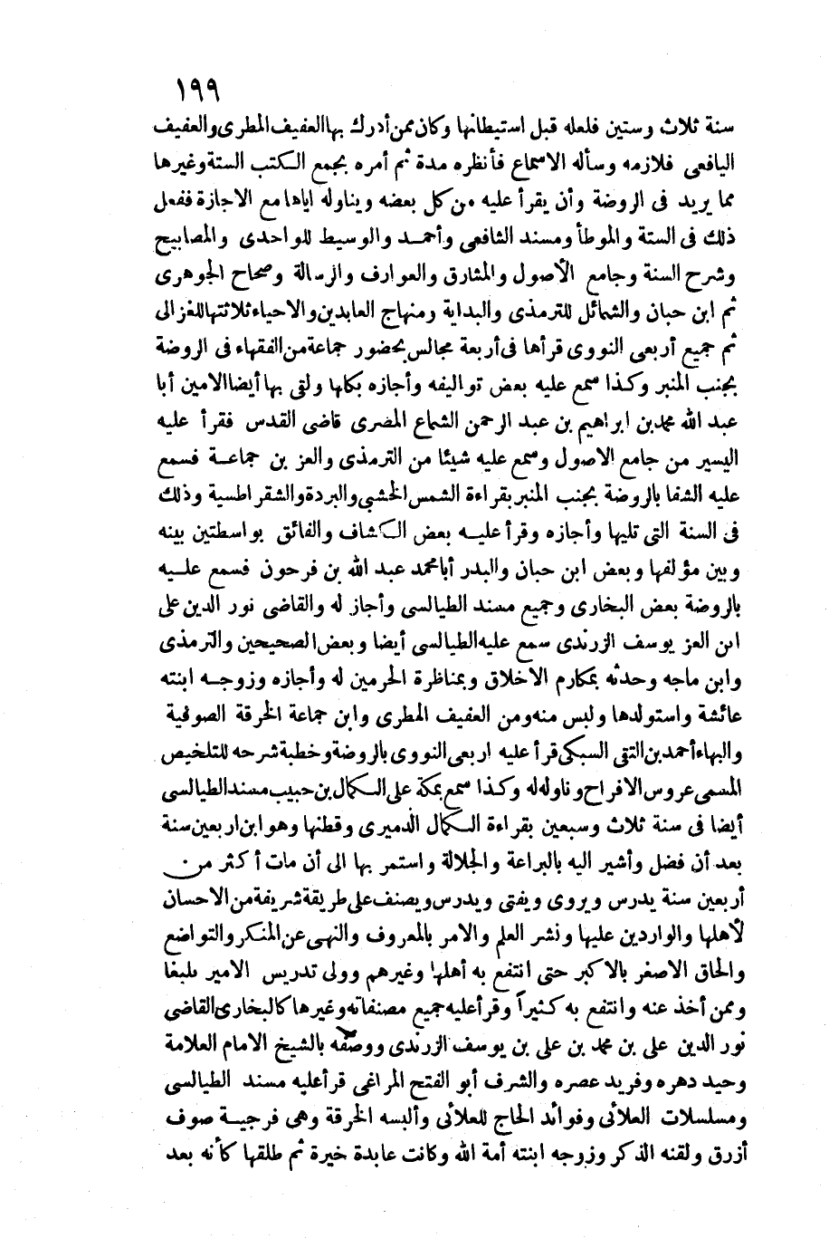 لِلتِّرْمِذِي والبداية ومنهاج العابدين والإحياء ثلاثتها للغزالي ثمَّ جَمِيع أربعي النَّوَوِيّ قَرَأَهَا فِي أَرْبَعَة مجَالِس بِحُضُور جمَاعَة من الْفُقَهَاء فِي الرَّوْضَة بِجنب الْمِنْبَر وَكَذَا سمع عَلَيْهِ بعض تواليفه وَأَجَازَهُ بكلها وَلَقي بهَا أَيْضا الْأمين أَبَا عبد الله مُحَمَّد بن إِبْرَاهِيم بن عبد الرَّحْمَن الشماع الْمصْرِيّ قَاضِي الْقُدس فَقَرَأَ عَلَيْهِ الْيَسِير من جَامع الْأُصُول وَسمع عَلَيْهِ شَيْئا من التِّرْمِذِيّ والعز بن جمَاعَة فَسمع عَلَيْهِ الشفا بالروضة بِجنب الْمِنْبَر بِقِرَاءَة الشَّمْس الخشبي والبردة والشقراطسية وَذَلِكَ فِي السّنة الَّتِي تَلِيهَا وَأَجَازَهُ وَقَرَأَ عَلَيْهِ بعض الْكَشَّاف وَالْفَائِق بواسطتين بَينه وَبَين مؤلفها وَبَعض ابْن حبَان والبدر أَبَا مُحَمَّد عبد الله بن فَرِحُونَ فَسمع عَلَيْهِ بالروضة بعض البُخَارِيّ وَجَمِيع مُسْند الطَّيَالِسِيّ وَأَجَازَ لَهُ وَالْقَاضِي نور الدّين على ابْن الْعِزّ يُوسُف الزرندي سمع عَلَيْهِ الطَّيَالِسِيّ أَيْضا وَبَعض الصَّحِيحَيْنِ وَالتِّرْمِذِيّ وَابْن مَاجَه وحدثه بمكارم الْأَخْلَاق بمناظرة الْحَرَمَيْنِ لَهُ وَأَجَازَهُ وزوجه ابْنَته عَائِشَة واستولدها وَلبس مِنْهُ وَمن الْعَفِيف المطري وَابْن جمَاعَة الْخِرْقَة الصُّوفِيَّة والبهاء أَحْمد بن التقي السُّبْكِيّ قَرَأَ عَلَيْهِ أربعي النَّوَوِيّ بالروضة وخطبة شَرحه للتلخيص المسى عروس الأفراح وناوله لَهُ وَكَذَا سمع بِمَكَّة على الْكَمَال بن حبيب مُسْند الطَّيَالِسِيّ أَيْضا فِي سنة ثَلَاث وَسبعين بِقِرَاءَة الْكَمَال الدَّمِيرِيّ وقطنها وَهُوَ ابْن أَرْبَعِينَ سنة بعد أَن فضل وأشير إِلَيْهِ بالبراعة وَالْجَلالَة وَاسْتمرّ بهَا إِلَى أَن مَاتَ أَكثر من أَرْبَعِينَ سنة يدرس ويروي ويفتي ويدرس ويصنف على طَريقَة شريفة من الْإِحْسَان لأَهْلهَا والواردين عَلَيْهَا وَنشر الْعلم وَالْأَمر بِالْمَعْرُوفِ وَالنَّهْي عَن الْمُنكر والتوضع وإلحاق الْأَصْغَر بالأكبر حَتَّى انْتفع بِهِ أَهلهَا وَغَيرهم وَولي تدريس الْأَمِير يلبغا وَمِمَّنْ أَخذ عَنهُ وانتفع بِهِ كثيرا وَقَرَأَ عَلَيْهِ جَمِيع مصنفاته وَغَيرهَا كالبخاري القَاضِي نور الدّين عَليّ بن مُحَمَّد بن عَليّ بن يُوسُف الزرندي وَوَصفه بالشيخ الإِمَام الْعَلامَة وحيد دهره وفريد عصره والشرف أَبُو الْفَتْح المراغي قَرَأَ عَلَيْهِ مُسْند الطَّيَالِسِيّ ومسلسلات العلائي وفوائد الْحَاج للعلائي وَألبسهُ الْخِرْقَة وَهِي فرجية صوف أَزْرَق ولقنه الذّكر وزوجه ابْنَته أمة الله وَكَانَت عابدة خيرة ثمَّ طَلقهَا كَأَنَّهُ بعد