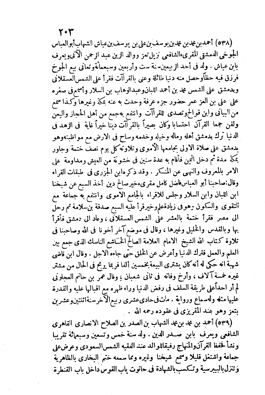538 - أَحْمد بن مُحَمَّد بن مُحَمَّد بن يُوسُف بن عَليّ بن يُوسُف بن عَيَّاش الشهَاب أَبُو الْعَبَّاس الجوخي الدِّمَشْقِي الْمُقْرِئ الشَّافِعِي نزيل تعز ووالد الزين عبد الرَّحْمَن الْآتِي وَيعرف بِابْن عَيَّاش. / ولد فِي أحد الربيعين سنة سِتّ وَأَرْبَعين وَسَبْعمائة وتعانى بيع الجوخ فرزق فِيهِ حظا وَحصل مِنْهُ دنيا طائلة وعني بالقراءات فَقَرَأَ على الشَّمْس الْعَسْقَلَانِي وبدمشق على الشَّمْس مُحَمَّد بن أَحْمد اللبان وَعبد الْوَهَّاب بن السلار وأسمع فِي صغره على عَليّ بن الْعِزّ عمر حُضُور جُزْء عَرَفَة وَحدث بِهِ عَنهُ بِمَكَّة وَغَيرهَا وَكَذَا سمع من الْبَيَانِي وَابْن قوالح وتصدى للقراءات وانتفع بِهِ جمع من أهل الْحجاز واليمن ولقن جمعا الْقُرْآن احتسابا وَكَانَ بَصيرًا بالقراءات دينا خيرا غَايَة فِي الزّهْد فِي الدُّنْيَا ترك بِدِمَشْق أَهله وَمَاله وخيله وخدمه وساح فِي الأَرْض مَعَ مواظبته وَهُوَ بِدِمَشْق على صَلَاة الأولى بجامعها الْأمَوِي وتلاوته كل يَوْم نصف ختمة وجاور بِمَكَّة مُدَّة ثمَّ دخل الْيمن فَأَقَامَ بِهِ عدَّة سِنِين فِي خشونة من الْعَيْش ومداومة على الْأَمر بِالْمَعْرُوفِ وَالنَّهْي عَن الْمُنكر. وَقد ذكره ابْن الْجَزرِي فِي طَبَقَات الْقُرَّاء وَقَالَ: صاحبنا أَبُو الْعَبَّاس فَاضل كَامِل مقرئ خير صَالح دين أَخذ السَّبع عَن شَيخنَا ابْن اللبان وَابْن السلار وَجلسَ للإقراء بالجامع الْأمَوِي وانتفع بِهِ جمَاعَة مَعَ التَّقْوَى والسكون وَهُوَ فِي زِيَادَة علم وَخير قَرَأَ عَلَيْهِ السَّبع صَدَقَة بن سَلامَة ثمَّ رَحل إِلَى مصر فَقَرَأَ ختمة بالعشر على الشَّمْس الْعَسْقَلَانِي، وَعَاد إِلَى دمشق فأقرأ بهَا وبالقدس والخليل وَغَيرهَا، وَقَالَ فِي مَوضِع آخر أخونا فِي الله وصاحبنا فِي تِلَاوَة كتاب الله الشَّيْخ الإِمَام الْعَلامَة الصَّالح الخاشع الناسك الَّذِي جمع بَين الْعلم وَالْعَمَل فَترك الدُّنْيَا وَأعْرض عَن الْخلق حَتَّى جَاءَهُ الْأَجَل. وَقَالَ ابْن قَاضِي شُهْبَة أَنه حكى لَهُ أَنه كَانَ يَشْتَرِي الْبيعَة بِخَمْسِينَ ألفا فَرُبمَا يربح فِي الْحَال من مُشْتَر غَيره خَمْسَة آلَاف، وأرخ وَفَاته فِي ثَانِي شعْبَان وَقَالَ عمر بن حَاتِم العجلوني لم أر أحدا على طَريقَة السّلف فِي رفض الدُّنْيَا وَرَاء ظَهره مَعَ إقبالها عَلَيْهِ وَالْقُدْرَة عَلَيْهَا مثله وَله سَماع وَرِوَايَة. مَاتَ فِي حادي عشري ريع الآخر سنة اثْنَتَيْنِ وَعشْرين بتعز وَهُوَ عِنْد المقريزي فِي عقوده رَحمَه الله.