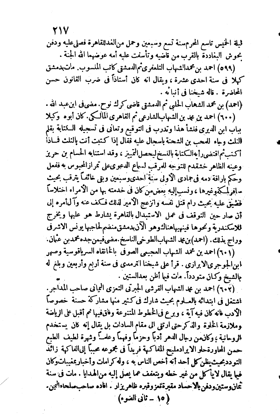 600 - أَحْمد بن مُحَمَّد بن الشهَاب الشارعي ثمَّ القاهري الْمَالِكِي. / كَانَ أَبوهُ وَكيلا بِبَاب ابْن الديري فَنَشَأَ هَذَا وتدرب فِي التوقيع وتعانى فِي تسجيله الْكِتَابَة بقلم الثُّلُث وَجَاء للمحب بن الشّحْنَة بأسجال عَلَيْهِ فَقَالَ إِذا كتبت أَنْت بِالثُّلثِ فَمَاذَا أكتب ثمَّ اقْتضى رَأْيه الْكِتَابَة بالنسخ ليحصل التَّمْيِيز، وَقد استنابه الحسام بن حريز وعينه الظَّاهِر خشقدم للتوجه للمرقب لسَمَاع الدَّعْوَى على تمراز الْمَحْبُوس بِهِ فَفعل وَحكم بإراقة دَمه فِي جُمَادَى الأولى سنة إِحْدَى وَسبعين وَبَقِي خَائفًا يترقب بِحَيْثُ سَافر لمَكَّة وَغَيرهَا وَنسب إِلَيْهِ بعض من كَانَ فِي خدمته بهَا من الْأُمَرَاء اختلاسا فضيق عَلَيْهِ بِحَيْثُ رام قتل نَفسه وانزعج الْأَمِير لذَلِك فَكف عَنهُ وَآل أمره إِلَى أَن صَار حِين التَّوَقُّف فِي عمل الِاسْتِبْدَال بِالْقَاهِرَةِ يشارط هُوَ عَلَيْهَا وَيخرج للاسكندرية وَنَحْوهَا فينهيها هُنَاكَ وَهُوَ الْآن بِدِمَشْق منضم لحاجبها يُونُس الأشرفي وراج بذلك.