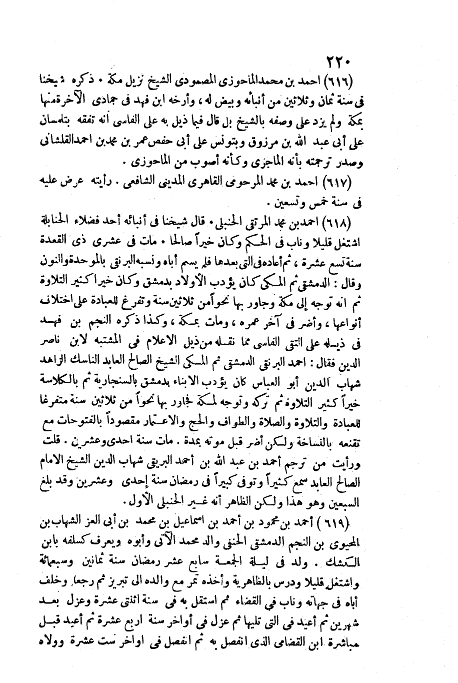 618 - أَحْمد بن مُحَمَّد المرتقي الْحَنْبَلِيّ. / قَالَ شَيخنَا فِي أنبائه أحد فضلاء الْحَنَابِلَة اشْتغل قَلِيلا وناب فِي الحكم وَكَانَ خيرا صَالحا. مَاتَ فِي عشري ذِي الْقعدَة سنة تسع عشرَة، ثمَّ أَعَادَهُ فِي الَّتِي بعْدهَا فَلم يسم أَبَاهُ وَنسبه البرنقي بِالْمُوَحَّدَةِ وَالنُّون وَقَالَ: الدِّمَشْقِي ثمَّ الْمَكِّيّ كَانَ يُؤَدب الْأَوْلَاد بِدِمَشْق وَكَانَ خيرا كثير التِّلَاوَة ثمَّ أَنه توجه إِلَى مَكَّة وجاور بهَا نَحوا من ثَلَاثِينَ سنة وتفرغ لِلْعِبَادَةِ على اخْتِلَاف أَنْوَاعهَا، وأضر فِي آخر عمره، وَمَات بِمَكَّة، وَكَذَا ذكره النَّجْم بن فَهد فِي ذيله على التقي الفاسي مِمَّا نَقله من ذيل الْأَعْلَام فِي المشتبه لِابْنِ نَاصِر الدّين فَقَالَ: أَحْمد البرنقي الدِّمَشْقِي ثمَّ الْمَكِّيّ الشَّيْخ الصَّالح العابد الناسك الزَّاهِد شهَاب الدّين أَبُو الْعَبَّاس كَانَ