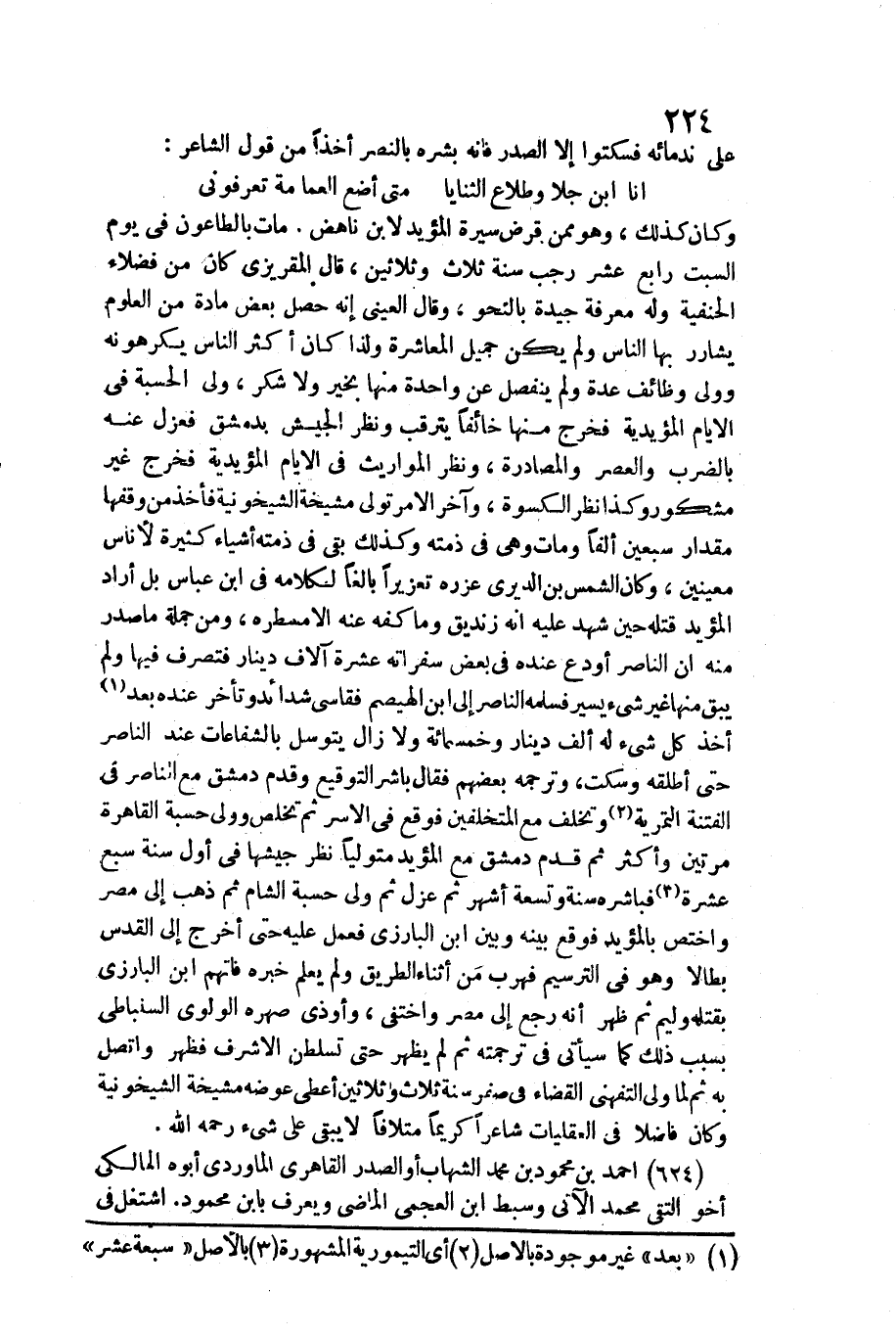 بَالغا لكَلَامه فِي ابْن عَبَّاس بل أَرَادَ الْمُؤَيد قَتله حِين شهد عَلَيْهِ أَنه زنديق وَمَا كَفه عَنهُ إِلَّا مسطره، وَمن جملَة مَا صدر مِنْهُ أَن النَّاصِر أودع عِنْده فِي بعض سفراته عشرَة آلَاف دِينَار فتصرف فِيهَا وَلم يبْق مِنْهَا غير شَيْء يسير فسلمه النَّاصِر إِلَى ابْن الهيصم فقاسى شَدَائِد وَتَأَخر عِنْده بعد أَخذ كل شَيْء لَهُ ألف دِينَار وَخَمْسمِائة وَلَا زَالَ يتوسل بالشفاعات عِنْد النَّاصِر حَتَّى أطلقهُ وَسكت، وترجمه بَعضهم فَقَالَ بَاشر التوقيع وَقدم دمشق مَعَ النَّاصِر فِي الْفِتْنَة التمرية وتخلف مَعَ المتخلفين فَوَقع فِي الْأسر ثمَّ تخلص وَولي حسبَة الْقَاهِرَة مرَّتَيْنِ وَأكْثر ثمَّ قدم دمشق مَعَ الْمُؤَيد مُتَوَلِّيًا نظر جيشها فِي أول سنة سبع عشرَة فباشره سنة وَتِسْعَة أشهر ثمَّ عزل ثمَّ ولي حسبَة الشَّام ثمَّ ذهب إِلَى مصر واختص بالمؤيد فَوَقع بَينه وَبَين ابْن الْبَارِزِيّ فَعمل عَلَيْهِ حَتَّى أخرج إِلَى الْقُدس بطالا وَهُوَ فِي الترسيم فهرب من أثْنَاء الطَّرِيق وَلم يعلم خَبره فاتهم ابْن الْبَارِزِيّ بقتْله وليم ثمَّ ظهر أَنه رَجَعَ إِلَى مصر واختفى، وأوذي صهره الولوي السنباطي بِسَبَب ذَلِك كَمَا سَيَأْتِي فِي تَرْجَمته ثمَّ لم يظْهر حَتَّى تسلطن الْأَشْرَف فَظهر واتصل بِهِ ثمَّ لما ولي التفهني الْقَضَاء فِي صفر سنة ثَلَاث وَثَلَاثِينَ وَأعْطى عوضه مشيخة الشيخونية وَكَانَ فَاضلا فِي العقليات شَاعِرًا كَرِيمًا متلافا لَا يبْقى على شَيْء رَحمَه الله.