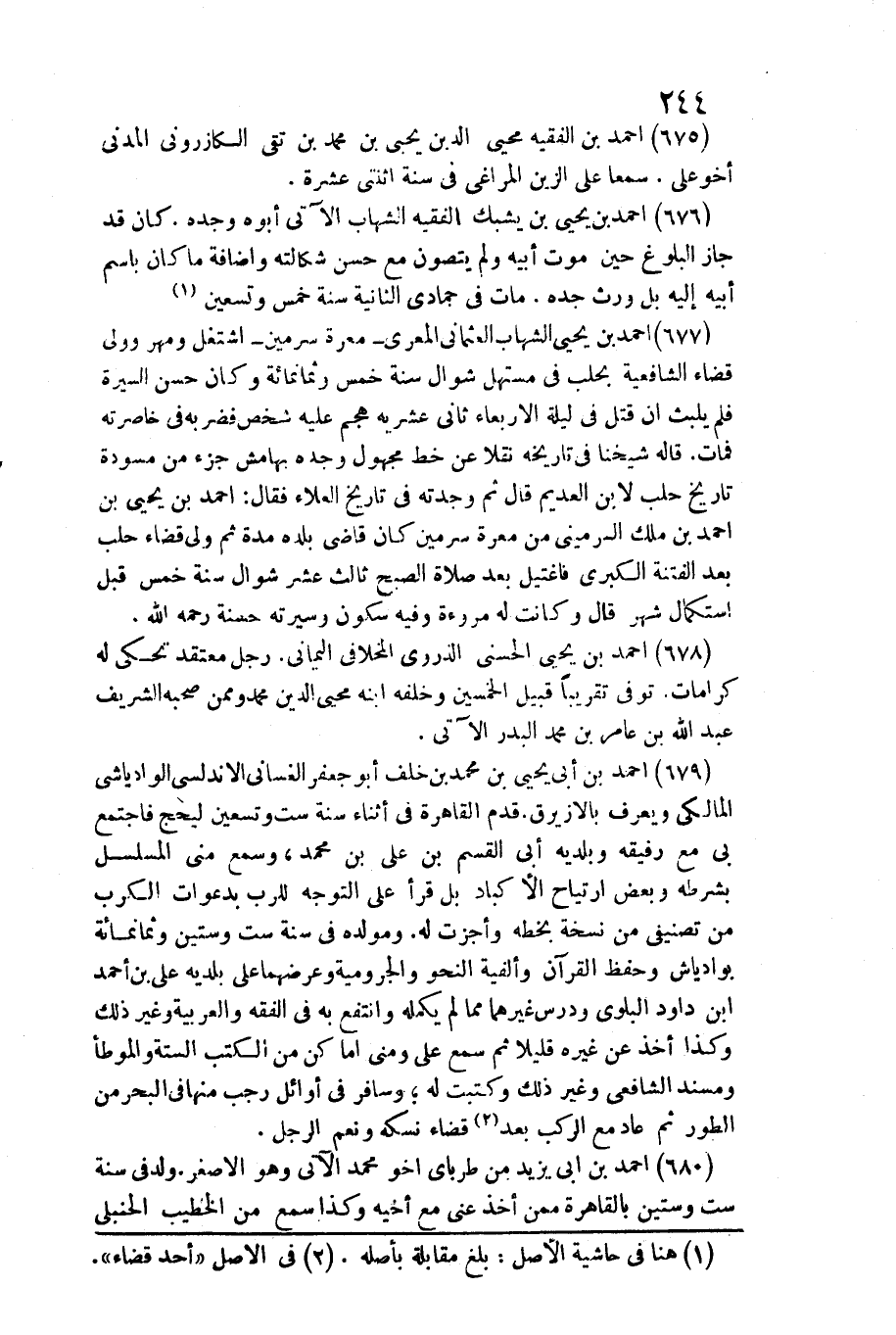 677 - أَحْمد بن يحيى الشهَاب العثماني المعري / معرة سرميناشتغل وَمهر وَولي قَضَاء الشَّافِعِيَّة بحلب فِي مستهل شَوَّال سنة خمس وَثَمَانمِائَة وَكَانَ حسن السِّيرَة فَلم يلبث أَن قتل فِي لَيْلَة الْأَرْبَعَاء ثَانِي عشرِيَّة هجم عَلَيْهِ شخص فَضَربهُ فِي خاصرته فَمَاتَ. قَالَه شَيخنَا فِي تَارِيخه نقلا عَن خطّ مَجْهُول وجده بِهَامِش جُزْء من مسودة تَارِيخ حلب لِابْنِ العديم قَالَ ثمَّ وجدته فِي تَارِيخ الْعَلَاء فَقَالَ: أَحْمد بن يحيى بن أَحْمد بن ملك السرميني من معرة سرمين كَانَ قَاضِي بَلَده مُدَّة ثمَّ ولي قَضَاء حلب بعد الْفِتْنَة الْكُبْرَى فاغتيل بعد صَلَاة الصُّبْح ثَالِث عشر شَوَّال سنة خمس قبل استكمال شهر قَالَ وَكَانَت لَهُ مُرُوءَة وَفِيه سُكُون وَسيرَته حَسَنَة رَحمَه الله.
