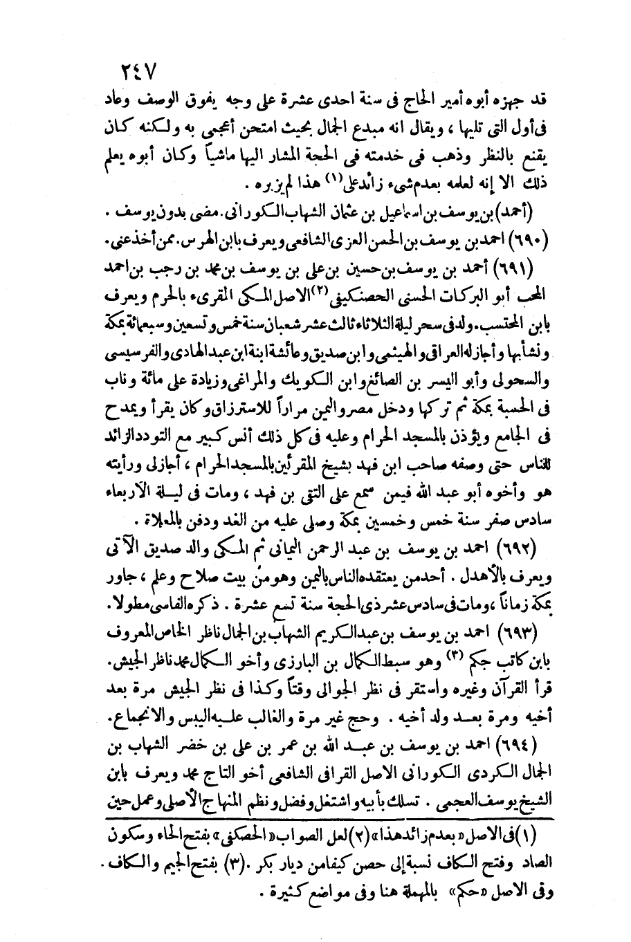 694 - أَحْمد بن يُوسُف بن عبد الله بن عمر بن عَليّ بن خضر الشهَاب بن الْجمال الْكرْدِي الكوراني الأَصْل الْقَرَافِيّ الشَّافِعِي أَخُو التَّاج مُحَمَّد وَيعرف بِابْن الشَّيْخ يُوسُف العجمي. / تسلك بِأَبِيهِ واشتغل وَفضل ونظم الْمِنْهَاج الْأَصْلِيّ وَعمل حِين