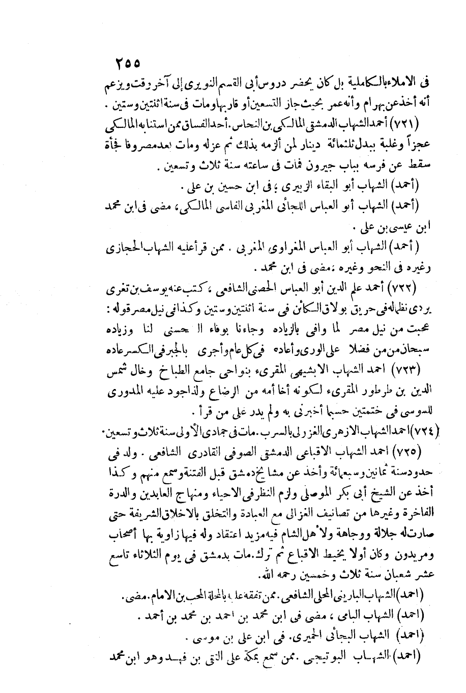 725 - أَحْمد الشهَاب الأقباعي الدِّمَشْقِي الصُّوفِي القادري الشَّافِعِي. / ولد فِي حُدُود سنة ثَمَانِينَ وَسَبْعمائة وَأخذ عَن مَشَايِخ دمشق قبل الْفِتْنَة وَسمع مِنْهُم وَكَذَا أَخذ عَن الشَّيْخ أبي بكر الْموصِلِي وَلزِمَ النّظر فِي الْإِحْيَاء ومنهاج العابدين والدرة الفاخرة وَغَيرهَا من تصانيف الْغَزالِيّ مَعَ الْعِبَادَة والتخلق بالأخلاق الشَّرِيفَة حَتَّى صَارَت لَهُ جلالة ووجاهة وَلأَهل الشَّام فِيهِ ميزد اعْتِقَاد وَله فِيهَا زَاوِيَة بهَا أَصْحَاب ومريدون وَكَانَ أَولا يخيط الأقباع ثمَّ ترك. مَاتَ بِدِمَشْق فِي يَوْم الثُّلَاثَاء تَاسِع عشر شعْبَان سنة ثَلَاث وَخمسين رَحمَه الله.