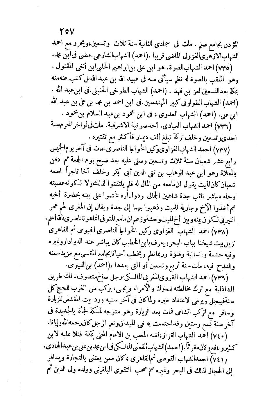 739 - أَحْمد الشهَاب الْقَرَوِي المغربي الْمَالِكِي / رجل صَالح متصوف سلك طَرِيق الشاذلية مَعَ ترك مخالطته للملوك والأمراء وَيَجِيء بركب من الغرب لِلْحَجِّ كل سنة فيبجل ويرعى لاعتقاد خَيره وَلما كَانَ فِي آخر سنيه ورد بَيت الْمُقَدّس للزيارة وسافر مَعَ الركب الشَّامي فَمَاتَ بعد الزِّيَارَة وَهُوَ مُتَوَجّه لمَكَّة فَجْأَة بالجديدة فِي آخر سنة تسع وَسِتِّينَ وَقد اجْتمعت بِهِ فِي الميدان وَنعم الرجل كَانَ رَحمَه الله وإيانا.