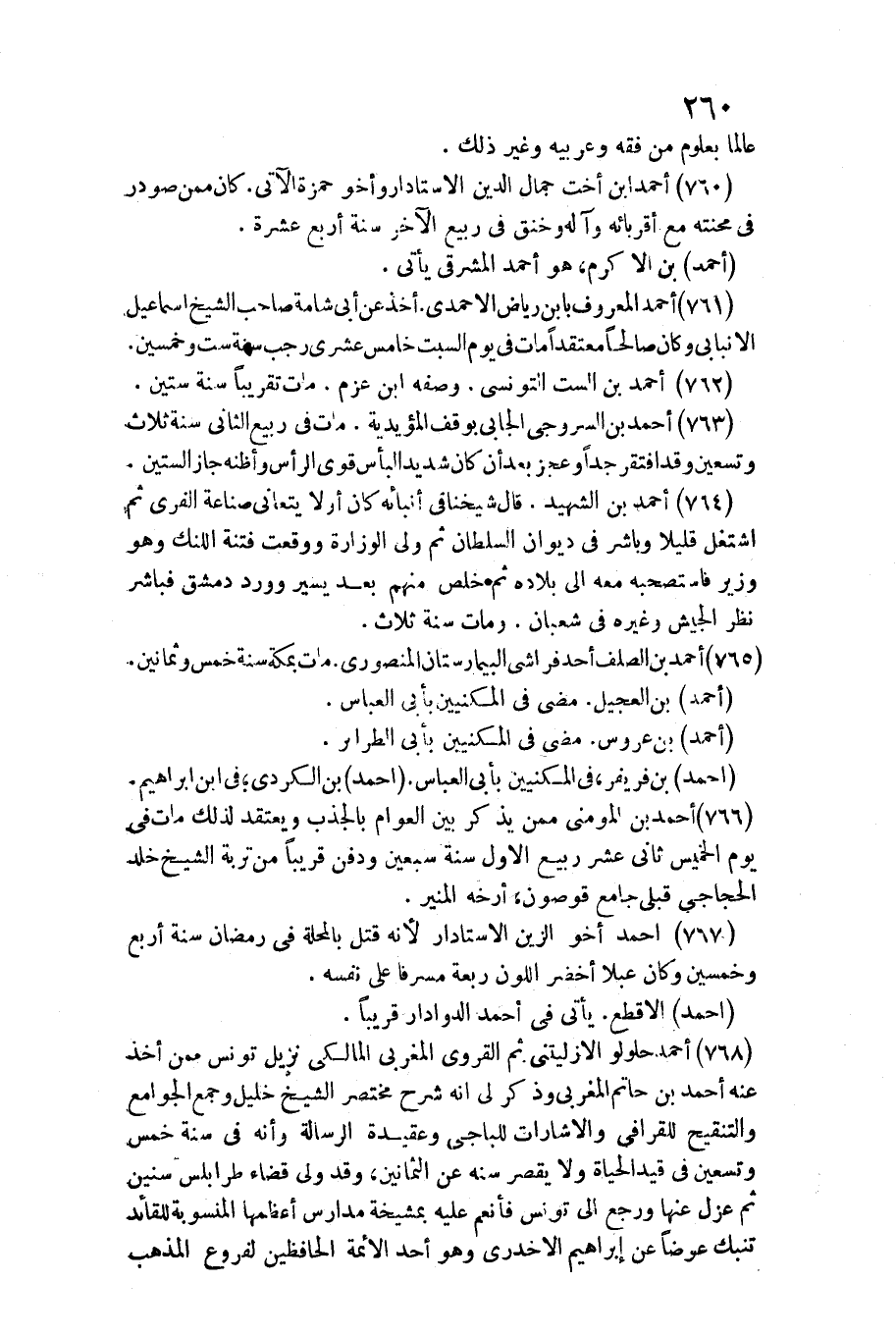 768 - أَحْمد حلولو الأزليتني ثمَّ الْقَرَوِي المغربي الْمَالِكِي نزيل تونس / مِمَّن أَخذ عَنهُ أَحْمد بن حَاتِم المغربي وَذكر لي أَنه شرح مُخْتَصر الشَّيْخ خَلِيل وَجمع الْجَوَامِع والتنقيح للقرافي والإشارات للباجي وعقيدة الرسَالَة وَأَنه فِي سنة خمس وَتِسْعين فِي قيد الْحَيَاة وَلَا يقصر سنة عَن الثَّمَانِينَ، وَقد ولي قَضَاء طرابلس سِنِين ثمَّ عزل عَنْهَا وَرجع إِلَى تونس فأنعم عَلَيْهِ بمشيخة مدارس أعظمها المنسوبة للقائد تنبك عوضا عَن إِبْرَاهِيم الأخدري وَهُوَ أحد الْأَئِمَّة الحافظين لفروع الْمَذْهَب