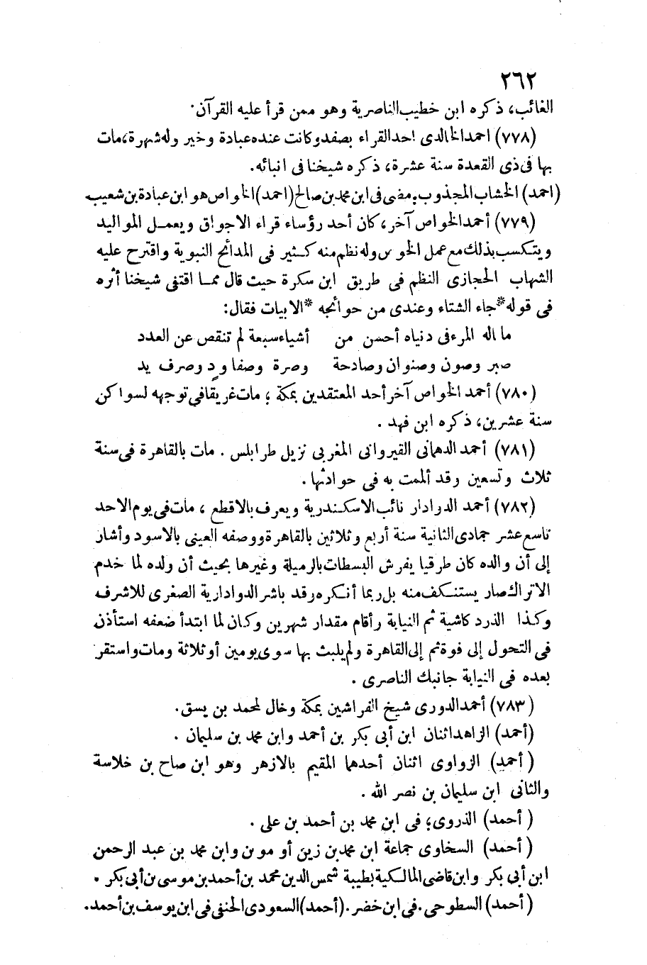 780 - أَحْمد الْخَواص آخر / أحد المعتقدين بِمَكَّة، مَاتَ غريقا فِي توجهه لسواكن سنة عشْرين، ذكره ابْن فَهد.
