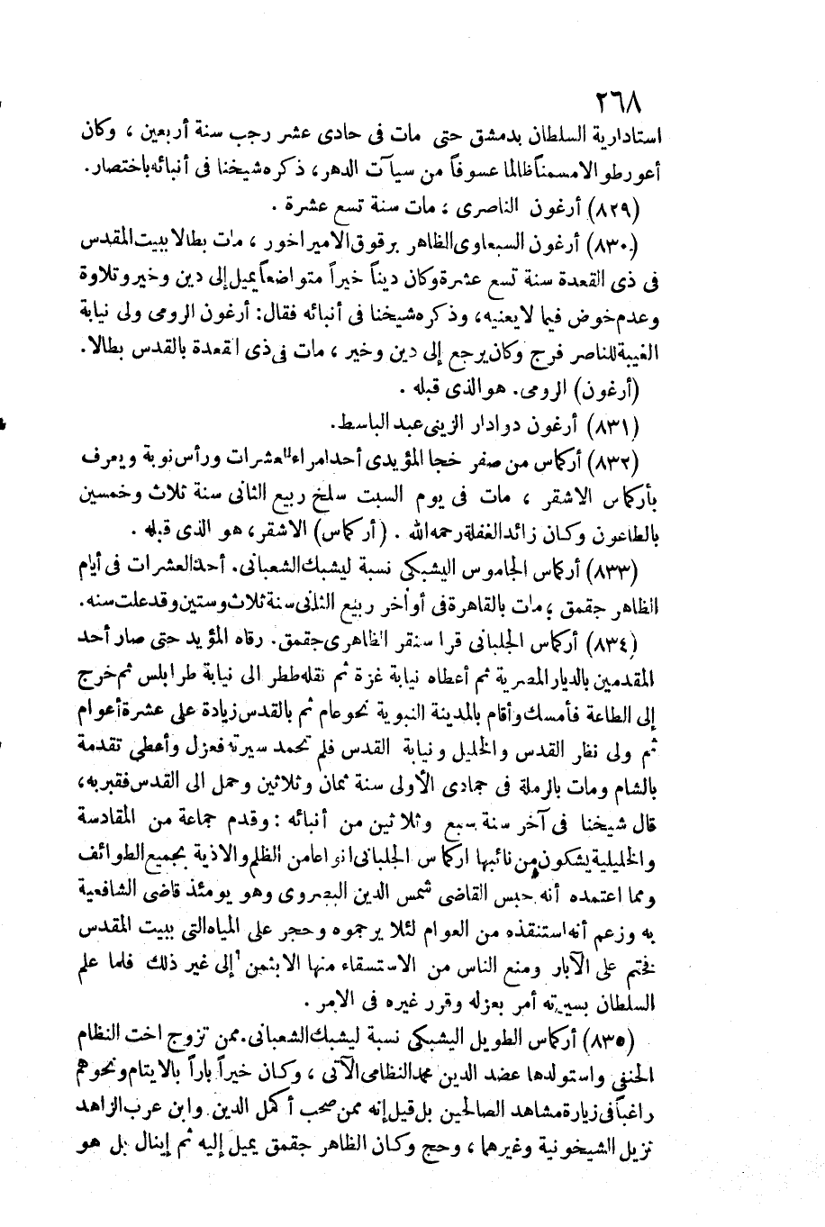834 - أركماس الجلباني قرا سنقر الظَّاهِرِيّ جقمق. / رقاه الْمُؤَيد حَتَّى صَار أحد المقدمين بالديار المصرية ثمَّ أعطَاهُ نِيَابَة غَزَّة ثمَّ نَقله ططر إِلَى نِيَابَة طرابلس ثمَّ خرج إِلَى الطَّاعَة فَأمْسك وَأقَام بِالْمَدِينَةِ النَّبَوِيَّة نَحْو عَام ثمَّ بالقدس زِيَادَة على عشرَة أَعْوَام ثمَّ ولي نظر الْقُدس والخليل ونيابة الْقُدس فَلم تحمد سيرته فعزل وَأعْطى تقدمة بِالشَّام وَمَات بالرملة فِي جُمَادَى الأولى سنة ثَمَان وَثَلَاثِينَ وَحمل إِلَى الْقُدس فقبربه، قَالَ شَيخنَا فِي آخر سنة سبع وَثَلَاثِينَ من أنبائه: وَقدم جمَاعَة من المقادسة والخليلية يَشكونَ من نائبها أركماس الجلباني أنواعا من الظُّلم والأذية بِجَمِيعِ الطوائف وَمِمَّا اعْتَمدهُ أَنه حبس القَاضِي شمس الدّين البصروي وَهُوَ يَوْمئِذٍ قَاضِي الشَّافِعِيَّة بِهِ وَزعم أَنه استنقذه من الْعَوام لِئَلَّا يرجموه وَحجر على الْمِيَاه الَّتِي بِبَيْت الْمُقَدّس فختم على الْآبَار وَمنع النَّاس من الاسْتِسْقَاء مِنْهَا إِلَّا بِثمن إِلَى غير ذَلِك فَلَمَّا علم السُّلْطَان بسيرته أَمر بعزله وَقرر غَيره فِي الْأَمر.