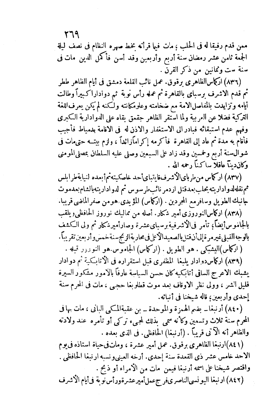 839 - أركماس دوادار يلبغا المظفري / قبل استقراره فِي الأتابكية ثمَّ دوادار يشبك الْأَعْرَج الساقي أتابكية كَانَ حسن السياسة عَارِفًا بالأمور مشكور السِّيرَة قَلِيل الشَّرّ، وَولي نظر الْأَوْقَاف بعد موت قطلوبغا حجى، مَاتَ فِي الْمحرم سنة إِحْدَى وَأَرْبَعين، قَالَه شَيخنَا فِي أنبائه.