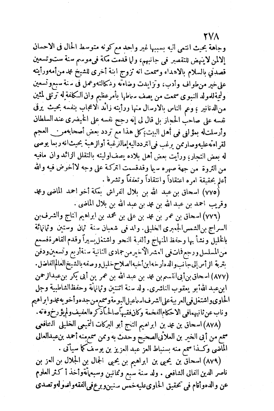 وجاهة بِحَيْثُ انْتَمَى إِلَيْهِ بِسَبَبِهَا غير وَاحِد مَعَ كَونه متوسط الْحَال فِي الْإِحْسَان إِلَّا لمن ينْهض للتقصير فِي جانبهم، وَلما قدمت مَكَّة فِي موسم سنة سِتّ وَتِسْعين قصدني بِالسَّلَامِ بالإهداء وَسمعت أَنه تزوج ابْنة أُخْرَى للشَّيْخ مُحَمَّد من أمه ورايته على خير من طواف وأدب، وتزايدت وضاءته، وشكالته وَعمل فِي سنة سبع وَتِسْعين وَلِيمَة للمولد النَّبَوِيّ سَمِعت من يصف سماطها بِأَمْر عَظِيم وَأَن الكلفة لَهُ ترتقي لمئين من الدَّنَانِير وَعم النَّاس بِالْإِرْسَال مِنْهَا ورأيته زَائِد الْإِعْجَاب بِنَفسِهِ بِحَيْثُ يرقى نَفسه على صَاحب الْحجاز بل قَالَ لي إِنَّه رجح نَفسه على الخيضري عِنْد السُّلْطَان وَأرْسلت لَهُ بمؤلفي فِي أهل الْبَيْت كل هَذَا مَعَ تردد بعض أَصْحَابه من الْعَجم لقرَاءَته عَلَيْهِ وَصَارَ مِمَّن يرغب فِي لتردد إِلَيْهِ إِمَّا للرغبة أَو الرهبة بِحَيْثُ أَنه رُبمَا يوصى لَهُ بعض التُّجَّار، وَرَأَيْت بعض أهل بِلَاده يصف أوليته بالتقلل الزَّائِد وَإِن مَا فِيهِ من الثروة من جِهَة صهره سِيمَا وَقد قسمت لتركة على وَجه لَا أخوض فِيهِ وَالله أعلم بِحَقِيقَة أمره اعتقادا وانتقادا وَتَعَفُّفًا وتشرفا.