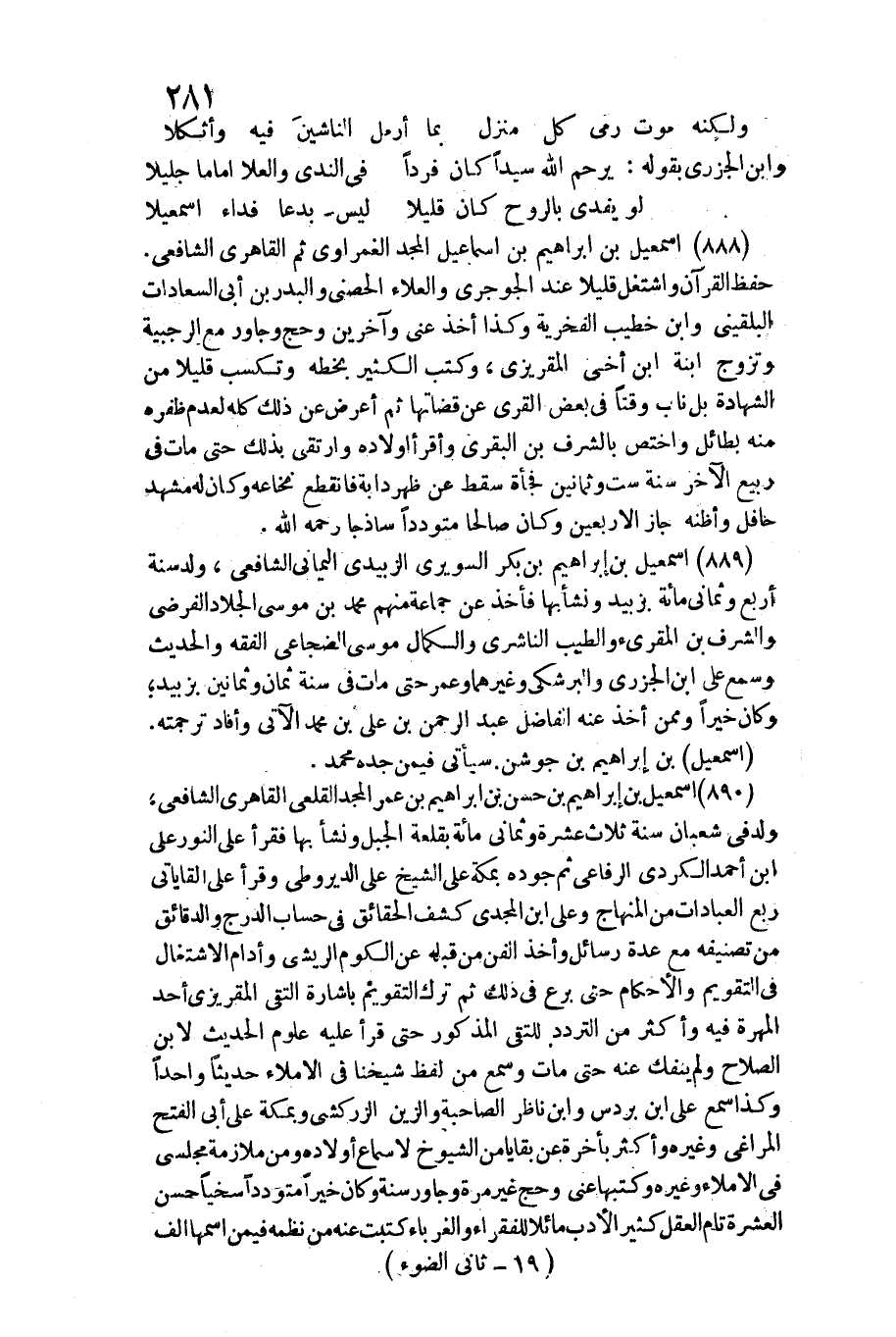 889 - إِسْمَاعِيل بن إِبْرَاهِيم بن بكر السويري الزبيدِيّ الْيَمَانِيّ الشَّافِعِي، / ولد سنة أَربع وثماني مائَة بزبيد وَنَشَأ بهَا فَأخذ عَن جمَاعَة مِنْهُم مُحَمَّد بن مُوسَى الجلاد الفرضي والشرف بن الْمُقْرِئ وَالطّيب الناشر والكمال مُوسَى الضجاعي الْفِقْه والْحَدِيث وَسمع على ابْن الْجَزرِي والبرشكي وَغَيرهمَا وَعمر حَتَّى مَاتَ فِي سنة ثَمَان وَثَمَانِينَ بزبيد وَكَانَ خيرا وَمِمَّنْ أَخذ عَنهُ الْفَاضِل عبد الرَّحْمَن بن عَليّ بن مُحَمَّد الْآتِي وَأفَاد تَرْجَمته.