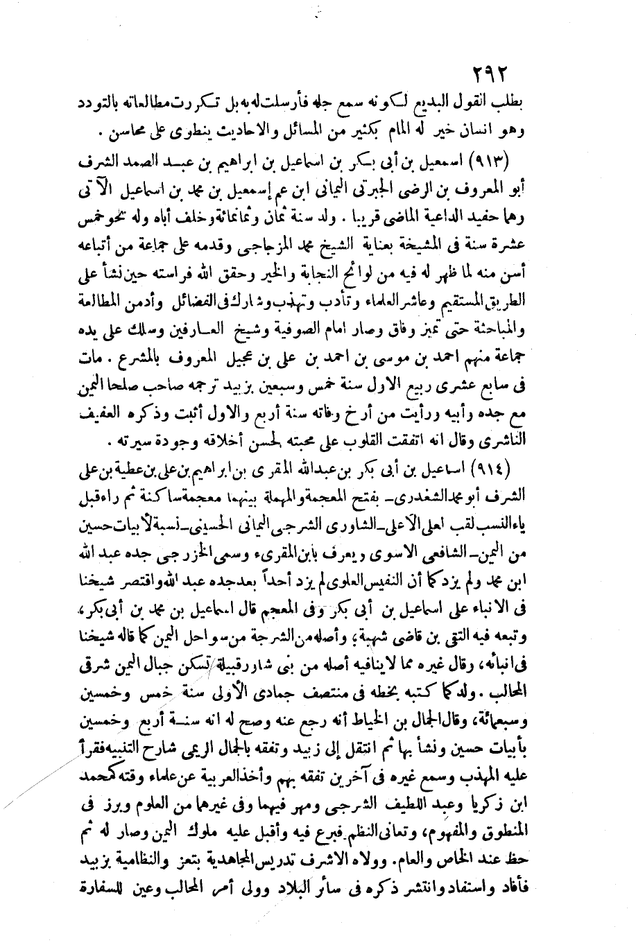 913 - إِسْمَاعِيل بن أبي بكر بن إِسْمَاعِيل بن إِبْرَاهِيم بن عبد الصَّمد الشّرف أَبُو الْمَعْرُوف بن الرضي الجبرتي الْيَمَانِيّ ابْن عَم إِسْمَاعِيل بن مُحَمَّد بن إِسْمَاعِيل الْآتِي وهما حفيد الداعية الْمَاضِي قَرِيبا. / ولد سنة ثَمَان وَثَمَانمِائَة وَخلف أَبَاهُ وَله نَحْو خمس عشرَة سنة فِي المشيخة بعناية الشَّيْخ مُحَمَّد المزجاجي وَقدمه على جمَاعَة من أَتْبَاعه أسن مِنْهُ لما ظهر لَهُ فِيهِ من لوائح النجابة وَالْخَيْر وحقق الله فراسته حِين نَشأ على الطَّرِيق الْمُسْتَقيم وعاشر الْعلمَاء وتأدب وتهذب وشارك فِي الْفَضَائِل وأدمن المطالعة والمباحثة حَتَّى تميز وفَاق وَصَارَ أَمَام الصُّوفِيَّة وَشَيخ العارفين وسلك على يَده جمَاعَة مِنْهُم أَحْمد بن مُوسَى بن أَحْمد بن عَليّ بن عجيل الْمَعْرُوف بالمشرع، مَاتَ فِي سَابِع عشري ربيع الأول سنة خمس وَسبعين بزبيد تَرْجمهُ صَاحب صَالحا الْيَمين مَعَ جده وَأَبِيهِ وَرَأَيْت من أرخ وَفَاته سنة أَربع وَالْأول أثبت وَذكره الْعَفِيف النَّاشِرِيّ وَقَالَ أَنه اتّفقت الْقُلُوب على محبته لحسن أخلاقه وجودة سيرته.