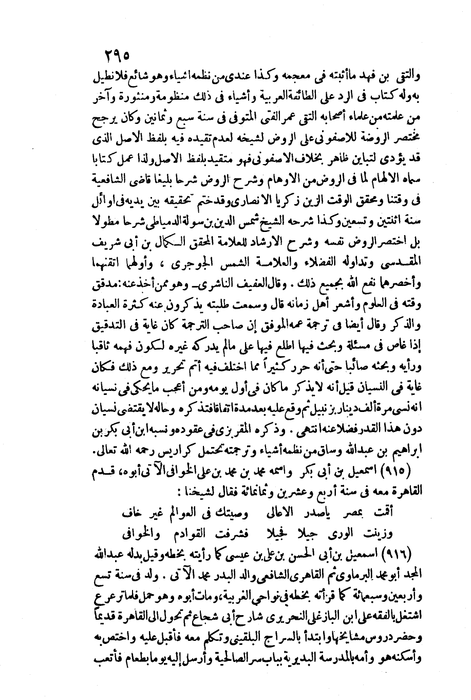 والتقى بن فَهد مَا أثْبته فِي مُعْجَمه وَكَذَا عِنْدِي من نظمه أَشْيَاء وَهُوَ شَائِع فَلَا نطيل بِهِ وَله كتاب فِي الرَّد على الطَّائِفَة الْعَرَبيَّة وَأَشْيَاء فِي ذَلِك منظومة ومنثورة وَآخر من عَلمته من عُلَمَاء أَصْحَابه التقي عمر الفتي المتوفي فِي سنة سبع وَثَمَانِينَ وَكَانَ يرجح مُخْتَصر الرَّوْضَة للأصفوني على الرَّوْض لشيخه لعدم تقيده فِيهِ بِلَفْظ الأَصْل الَّذِي قد يُؤَدِّي لتباين ظَاهر بِخِلَاف الأصفوني فَهُوَ متقيد بِلَفْظ الأَصْل وَلذَا عمل كتابا سَمَّاهُ الإلهام لما فِي الرَّوْض من الأوهام وَشرح الرَّوْض شرحا بليغا قَاضِي الشَّافِعِيَّة فِي وقتنا ومحقق الْوَقْت الزين زَكَرِيَّا الْأنْصَارِيّ وَقد ختم تَحْقِيقه بَين يَدَيْهِ فِي أَوَائِل سنة اثْنَتَيْنِ وَتِسْعين وَكَذَا شَرحه الشَّيْخ شمس الدّين بن سولة الدمياطي شرحا مطولا بل اختصر الرَّوْض نَفسه وَشرح الْإِرْشَاد للعلامة الْمُحَقق الْكَمَال بن أبي شرِيف الْمَقْدِسِي وتداوله الْفُضَلَاء والعلامة الشَّمْس الْجَوْجَرِيّ، وأولهما أتقنهما وأخصرهما نفع الله بِجَمِيعِ ذَلِك. وَقَالَ الْعَفِيف النَّاشِرِيّ. وَهُوَ مِمَّن أَخذ عَنهُ: مدقق وقته فِي الْعُلُوم وأشعر أهل زَمَانه قَالَ وَسمعت طلبته يذكرُونَ عَنهُ كَثْرَة الْعِبَادَة وَالذكر وَقَالَ أَيْضا فِي تَرْجَمَة عَمه)