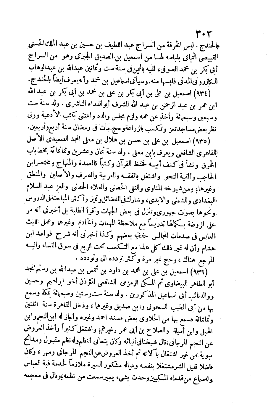 934 - إِسْمَاعِيل بن عَليّ بن أبي بكر بن عَليّ بن مُحَمَّد بن أبي بكر بن عبد الله بن عمر بن عبد الرَّحْمَن بن عبد الله الشّرف أَبُو الْفِدَاء النَّاشِرِيّ. / ولد سنة سِتّ وَسبعين وَسَبْعمائة وَأخذ عَن عَمه وَلزِمَ مجْلِس وَالِده واعتنى بكتب الْأَدْعِيَة وَولي نظر بعض مَسَاجِد تعز وتكسب بالزراعة وَحج. مَاتَ فِي رَمَضَان سنة أَربع وَأَرْبَعين.
