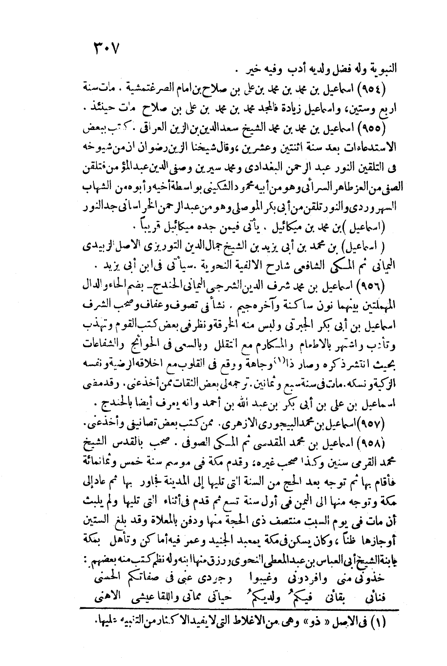 958 - إِسْمَاعِيل بن مُحَمَّد الْمَقْدِسِي ثمَّ الْمَكِّيّ الصُّوفِي. / صحب بالقدس الشَّيْخ مُحَمَّد القرمي سِنِين وَكَذَا صحب غَيره، وَقدم مَكَّة فِي موسم سنة خمس وَثَمَانمِائَة فَأَقَامَ بهَا ثمَّ توجه بعد الْحَج من السّنة الَّتِي تَلِيهَا إِلَى الْمَدِينَة فجاور بهَا ثمَّ عَاد إِلَى مَكَّة وَتوجه مِنْهَا إِلَى الْيمن فِي أول سنة تسع ثمَّ