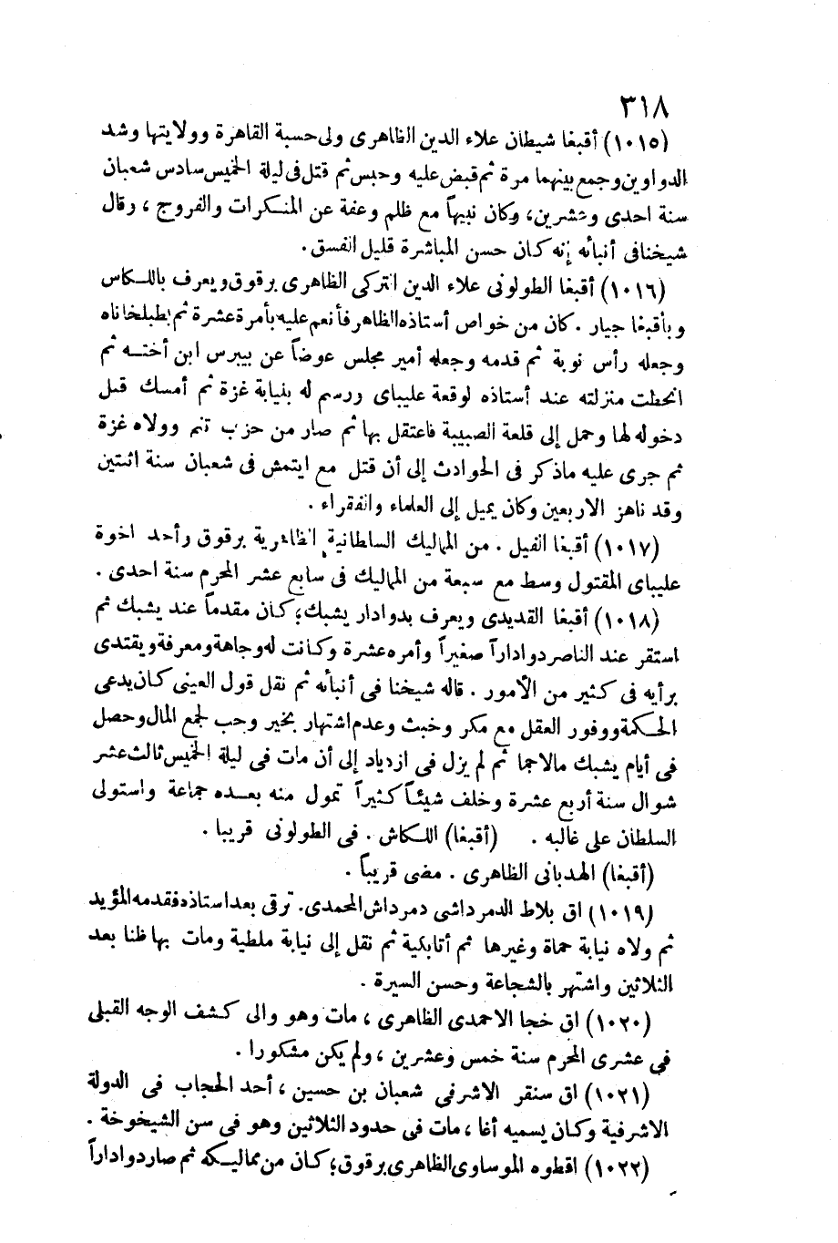 1015 - أقبعا شَيْطَان عَلَاء الدّين الظَّاهِرِيّ / ولي حسبَة الْقَاهِرَة وولايتها وَشد الدَّوَاوِين وَجمع بَينهمَا مرّة ثمَّ قبض عَلَيْهِ وَحبس ثمَّ قتل فِي لَيْلَة الْخَمِيس سادس شعْبَان سنة إِحْدَى وَعشْرين، وَكَانَ نبيها مَعَ ظلم وعفة عَن الْمُنْكَرَات والفروج، وَقَالَ شَيخنَا فِي أنبائه إِنَّه كَانَ حسن الْمُبَاشرَة قَلِيل الْفسق.