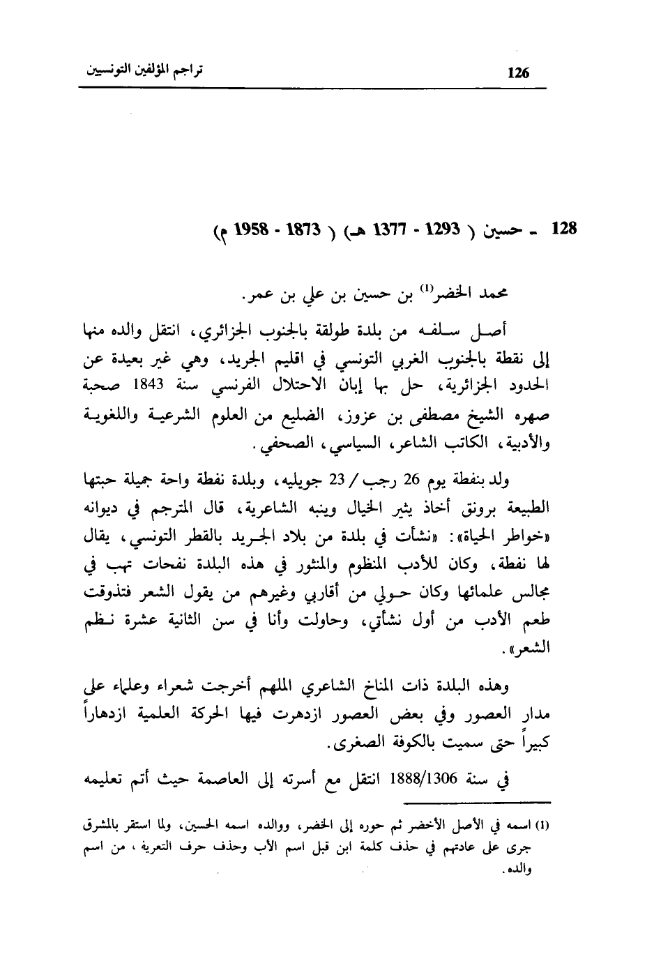 (¬1) اسمه في الأصل الأخضر ثم حوره إلى الخضر، ووالده اسمه الحسين، ولما استقر بالمشرق جرى على عادتهم في حذف كلمة ابن قبل اسم الأب وحذف حرف التعريف من اسم والده.