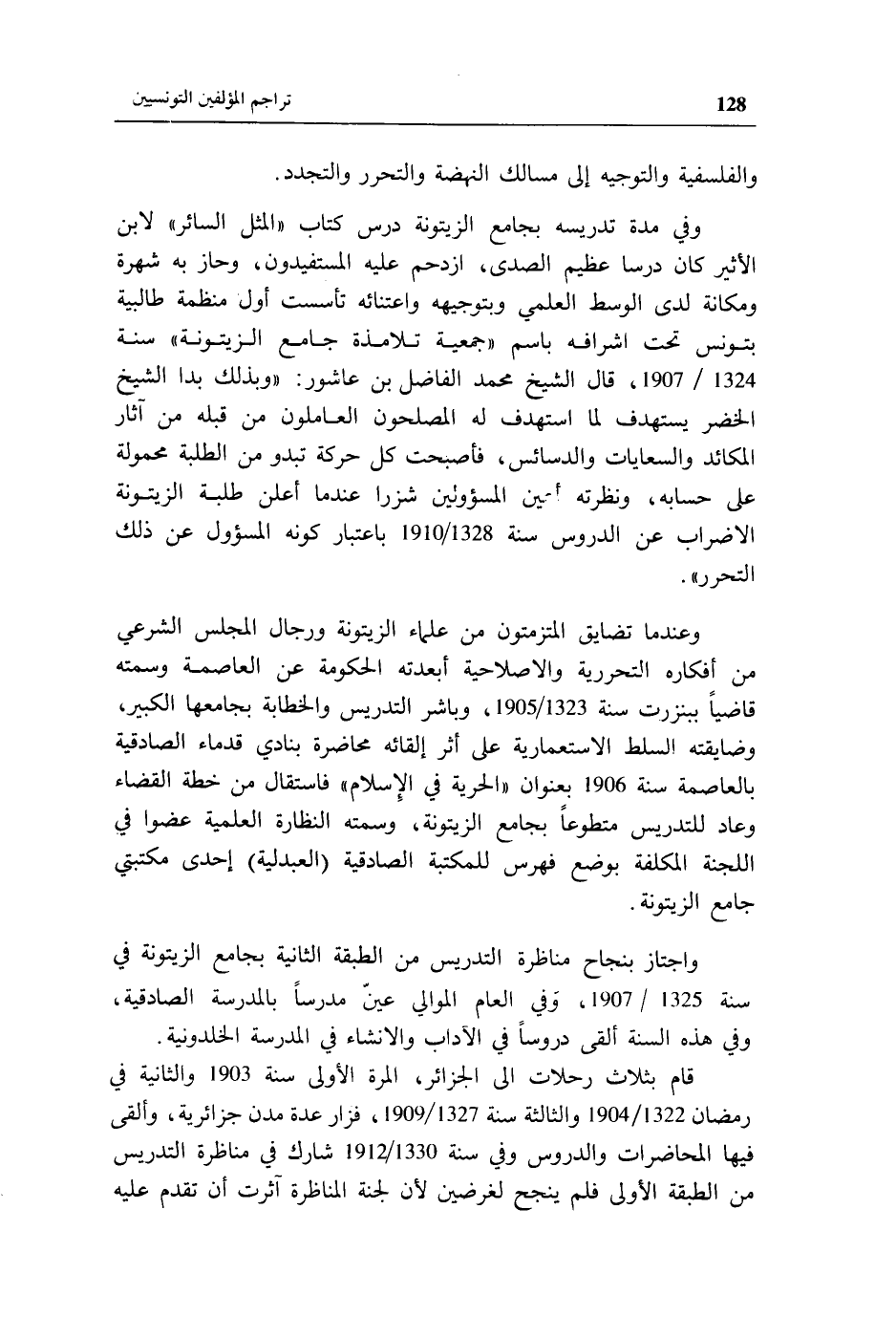 وفي مدة تدريسه بجامع الزيتونة درس كتاب «المثل السائر» لابن الأثير كان درسا عظيم الصدى، ازدحم عليه المستفيدون، وحاز به شهرة ومكانة لدى الوسط العلمي وبتوجيهه واعتنائه تأسست أول منظمة طالبية بتونس تحت اشرافه باسم «جمعية تلامذة جامع الزيتونة» سنة 1324/ 1907، قال الشيخ محمد الفاضل بن عاشور: «وبذلك بدا الشيخ الخضر يستهدف لما استهدف له المصلحون العاملون من قبله من آثار المكائد والسعايات والدسائس، فأصبحت كل حركة تبدو من الطلبة محمولة على حسابه، ونظرته أعين المسئولين شزرا عند ما أعلن طلبة الزيتونة الاضراب عن الدروس سنة 1328/ 1910 باعتبار كونه المسئول عن ذلك التحرر».