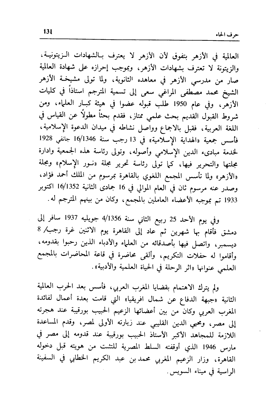 العالمية في الأزهر بتفوق لأن الأزهر لا يعترف بالشهادات الزيتونية، والزيتونة لا تعترف بشهادات الأزهر، وبموجب إحرازه على شهادة العالمية صار من مدرسي الأزهر في معاهده الثانوية، ولما تولى مشيخة الأزهر الشيخ محمد مصطفى المراغي سعى إلى تسمية المترجم استاذا في كليات الأزهر، وفي عام 1950 طلب قبوله عضوا في هيئة كبار العلماء، ومن شروط القبول القديم بحث علمي ممتاز، فقدم بحثا مطولا عن القياس في اللغة العربية، فقبل بالاجماع وواصل نشاطه في ميدان الدعوة الإسلامية، فأسس جمعية «الهداية الإسلامية» في 13 رجب سنة 1346/ 16 جانفي 1928 لخدمة مبادئ الدين الإسلامي وأصوله، وتولى رئاسة هذه الجمعية وادارة مجلتها والتحرير فيها، كما تولى رئاسة تحرير مجلة «نور الإسلام» ومجلة «الأزهر» ولما تأسس المجمع اللغوي بالقاهرة بمرسوم من الملك أحمد فؤاد، وصدر عنه مرسوم ثان في العام الموالي في 16 جمادى الثانية 1352/ 16 اكتوبر 1933 تم بموجبه الأعضاء العاملين بالمجمع، وكان من بينهم المترجم له.