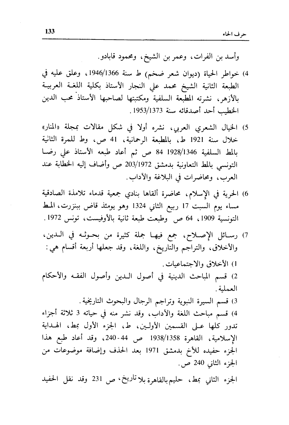 5) الخيال الشعري العربي، نشره أولا في شكل مقالات بمجلة «المنار» خلال سنة 1921 ط، بالمطبعة الرحمانية، 41 ص، وط للمرة الثانية بالمط السلفية 1346/ 1928، 84 ص ثم أعاد طبعه الأستاذ علي رضا التونسي بالمط التعاونية بدمشق 1972/ 203 ص وأضاف إليه الخطابة عند العرب، ومحاضرات في البلاغة والآداب.