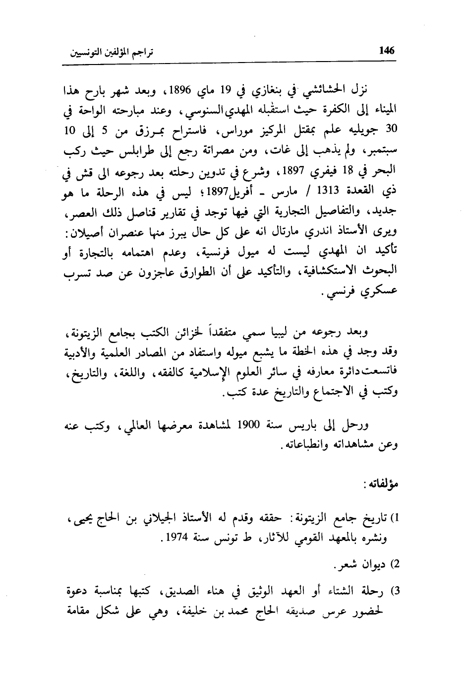 نزل الحشائشي في بنغازي في 19 ماي 1896، وبعد شهر بارح هذا الميناء إلى الكفرة حيث استقبله المهدي السنوسي، وعند مبارحته الواحة في 30 جويليه علم بمقتل المركيز موراس، فاستراح بمرزق من 5 إلى 10 سبتمبر، ولم يذهب إلى غات، ومن مصراتة رجع إلى طرابلس حيث ركب البحر في 18 فيفري 1897، وشرع في تدوين رحلته بعد رجوعه الى قش في ذي القعدة /1313 مارس - أفريل 1897؛ ليس في هذه الرحلة ما هو جديد، والتفاصيل التجارية التي فيها توجد في تقارير قناصل ذلك العصر، ويرى الأستاذ اندري مارتال انه على كل حال يبرز منها عنصران أصيلان: