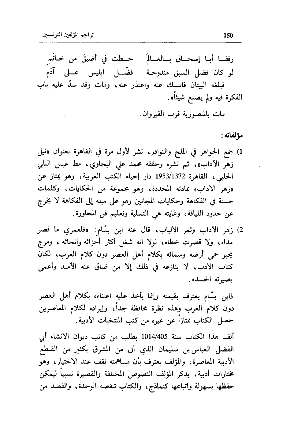 2) زهر الآداب وثمر الألباب، قال عنه ابن بسّام: «فلعمري ما قصر مداه، ولا قصرت خطاه، لولا أنه شغل أكثر أجزائه وأنحائه، ومرج يحبو حمى أرضه وسمائه بكلام أهل العصر دون كلام العرب، لكان كتاب الأدب، لا ينازعه في ذلك إلا من ضاق عنه الأمد وأعمى بصيرته الحسد».