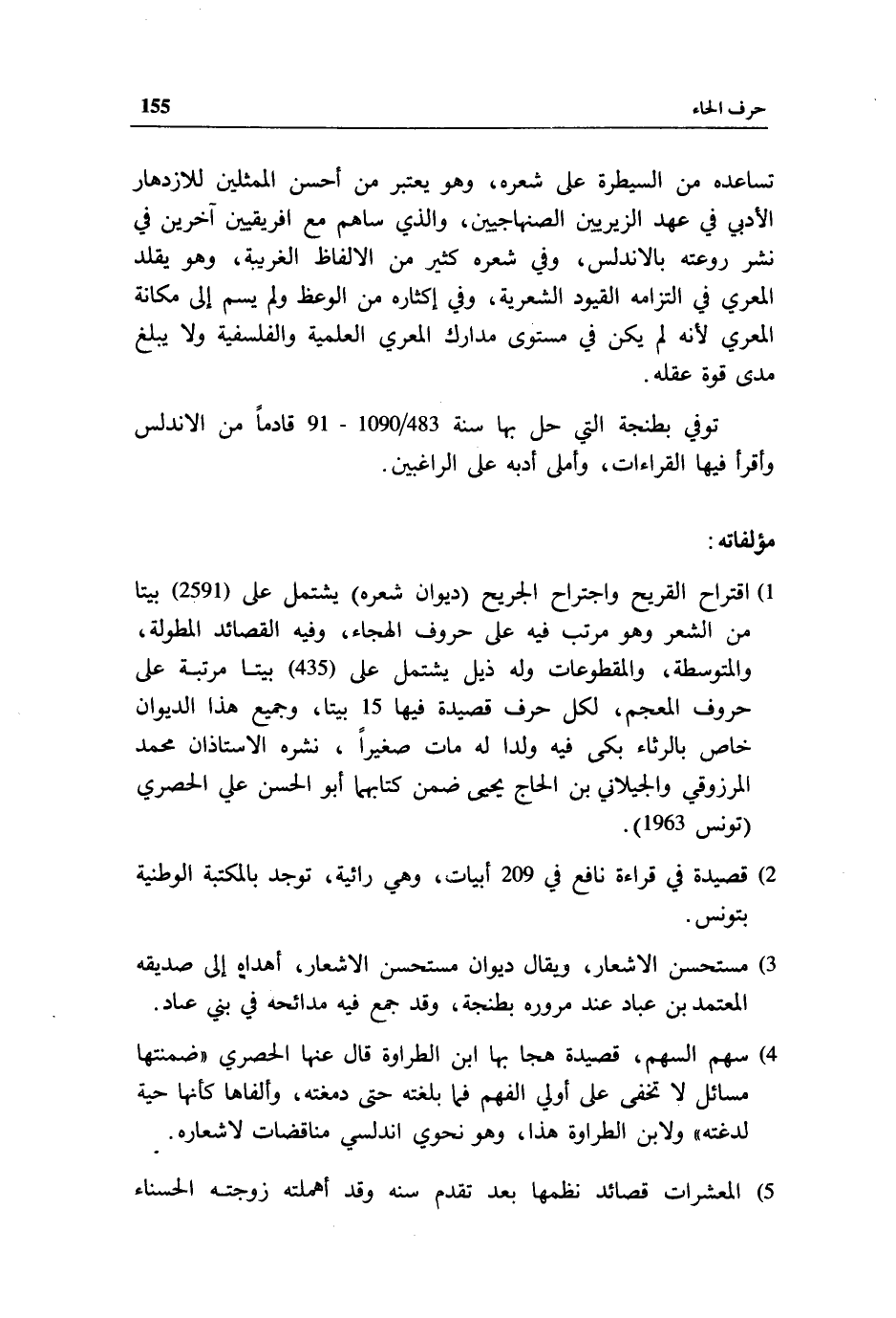 تساعده من السيطرة على شعره، وهو يعتبر من أحسن الممثلين للازدهار الأدبي في عهد الزيريين الصنهاجيين، والذي ساهم مع افريقيين آخرين في نشر روعته بالاندلس، وفي شعره كثير من الالفاظ الغريبة، وهو يقلد المعري في التزامه القيود الشعرية، وفي إكثاره من الوعظ ولم يسم إلى مكانة المعري لأنه لم يكن في مستوى مدارك المعري العلمية والفلسفية ولا يبلغ مدى قوة عقله.