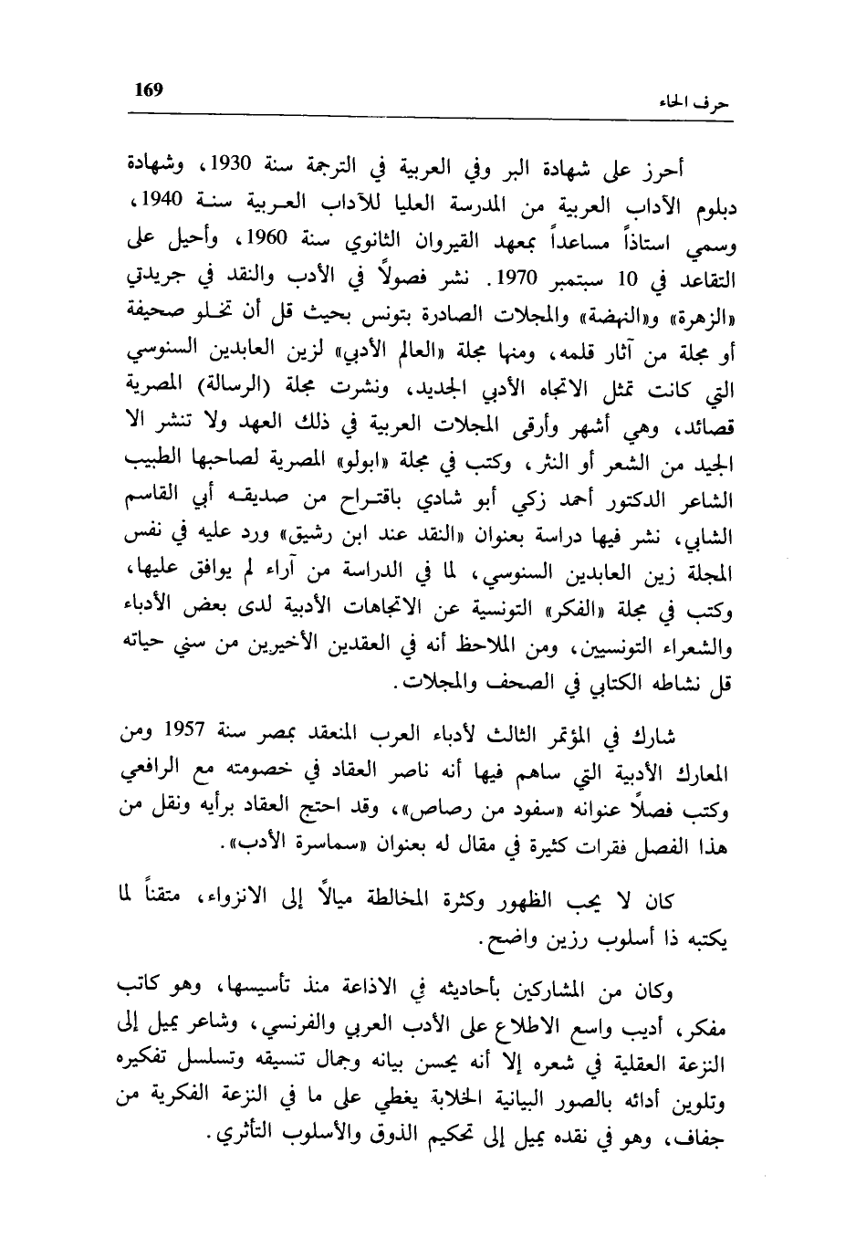 أحرز على شهادة البر وفي العربية في الترجمة سنة 1930، وشهادة دبلوم الآداب العربية من المدرسة العليا للآداب العربية سنة 1940، وسمي استاذا مساعدا بمعهد القيروان الثانوي سنة 1960، وأحيل على التقاعد في 10 سبتمبر 1970.نشر فصولا في الأدب والنقد في جريدتي «الزهرة» و «النهضة» والمجلات الصادرة بتونس بحيث قل أن تخلو صحيفة أو مجلة من آثار قلمه، ومنها مجلة «العالم الأدبي» لزين العابدين السنوسي التي كانت تمثل الاتجاه الأدبي الجديد، ونشرت مجلة (الرسالة) المصرية قصائد، وهي أشهر وأرقى المجلات العربية في ذلك العهد ولا تنشر الا الجيد من الشعر أو النثر، وكتب في مجلة «ابولو» المصرية لصاحبها الطبيب الشاعر الدكتور أحمد زكي أبو شادي باقتراح من صديقه أبي القاسم الشابي، نشر فيها دراسة بعنوان «النقد عند ابن رشيق» ورد عليه في نفس المجلة زين العابدين السنوسي، لما في الدراسة من آراء لم يوافق عليها، وكتب في مجلة «الفكر» التونسية عن الاتجاهات الأدبية لدى بعض الأدباء والشعراء التونسيين، ومن الملاحظ أنه في العقدين الأخيرين من سني حياته قل نشاطه الكتابي في الصحف والمجلات.