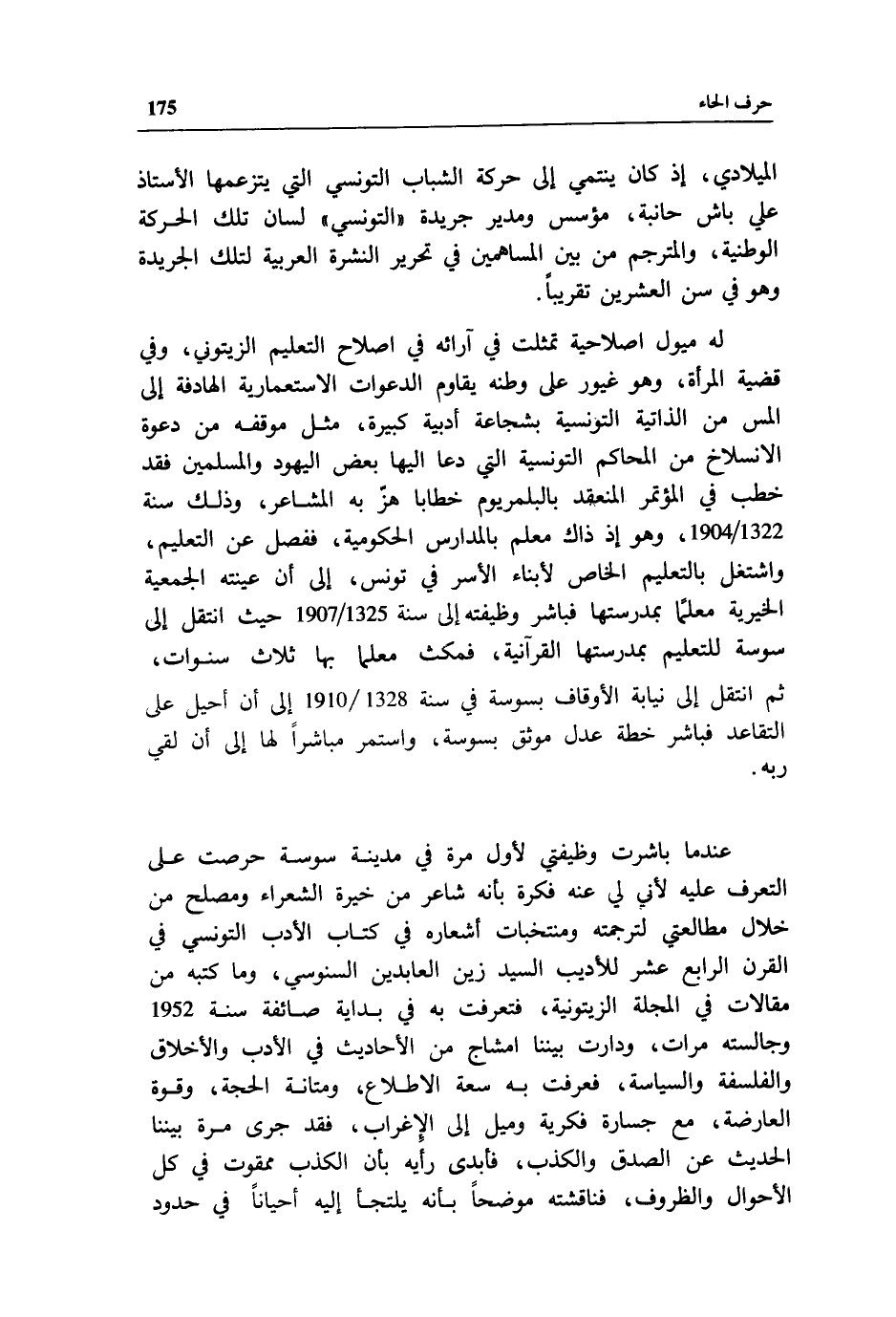 عند ما باشرت وظيفتي لأول مرة في مدينة سوسة حرصت على التعرف عليه لأني لي عنه فكرة بأنه شاعر من خيرة الشعراء ومصلح من خلال مطالعتي لترجمته ومنتخبات أشعاره في كتاب الأدب التونسي في القرن الرابع عشر للأديب السيد زين العابدين السنوسي، وما كتبه من مقالات في المجلة الزيتونية، فتعرفت به في بداية صائفة سنة 1952 وجالسته مرات، ودارت بيننا امشاج من الأحاديث في الأدب والأخلاق والفلسفة والسياسة، فعرفت به سعة الاطلاع، ومتانة الحجة، وقوة العارضة، مع جسارة فكرية وميل إلى الإغراب، فقد جرى مرة بيننا الحديث عن الصدق والكذب، فأبدى رأيه بأن الكذب ممقوت في كل الأحوال والظروف، فناقشته موضحا بأنه يلتجئ إليه أحيانا في حدود