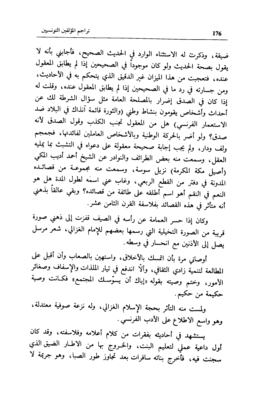 ضيقة، وذكرت له الاستثناء الوارد في الحديث الصحيح، فأجابني بأنه لا يقول بصحة الحديث ولو كان موجودا في الصحيحين إذا لم يطابق المعقول عنده، فتعجبت من هذا الميزان غير الدقيق الذي يتحكم به في الأحاديث، ومن جسارته في رد ما في الصحيحين إذا لم يطابق المعقول عنده، وقلت له إذا كان في الصدق إضرار بالمصلحة العامة مثل سؤال الشرطة لك عن أحداث وأشخاص يقومون بنشاط وطني (والثورة قائمة آنذاك في البلاد ضد الاستعمار الفرنسي) هل من المعقول تجنب الكذب وقول الصدق لأنه صدق؟ ولو أضر بالحركة الوطنية وبالأشخاص العاملين لفائدتها، فجمجم ولف ودار، ولم يجب إجابة صحيحة معقولة على دعواه في التشبث بما يمليه العقل، وسمعت منه بعض الطرائف والنوادر عن الشيخ أحمد أديب المكي (أصيل مكة المكرمة) نزيل سوسة، وسمعت منه مجموعة من قصائده المدونة في دفتر من القطع الربعي، وغاب عني اسمه لطول المدة هل هو النعم في النقم أهو اسم أطلقه على طائفة من قصائده؟ وبقي عالقا بذهني أنه متأثر في هذه القصائد بفلاسفة القرن الثامن عشر.