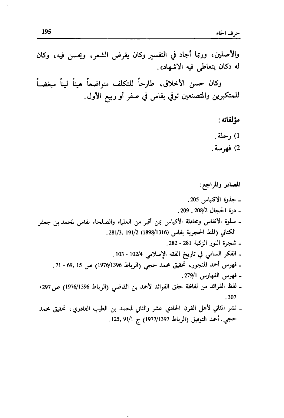 - سلوة الأنفاس ومحادثة الأكياس بمن أقبر من العلماء والصلحاء بفاس لمحمد بن جعفر الكتاني (المط الحجرية بفاس (1316/ 1898) 2/ 191، 3/ 281.