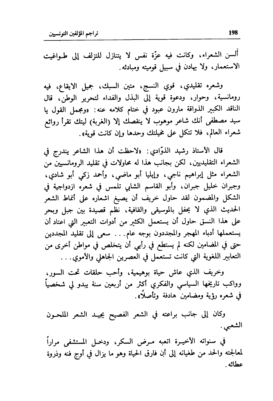 ألسن الشعراء، وكانت فيه عزّة نفس لا يتنازل للتزلف إلى طواغيت الاستعمار، ولا يهادن في سبيل قوميته ومبادئه.
