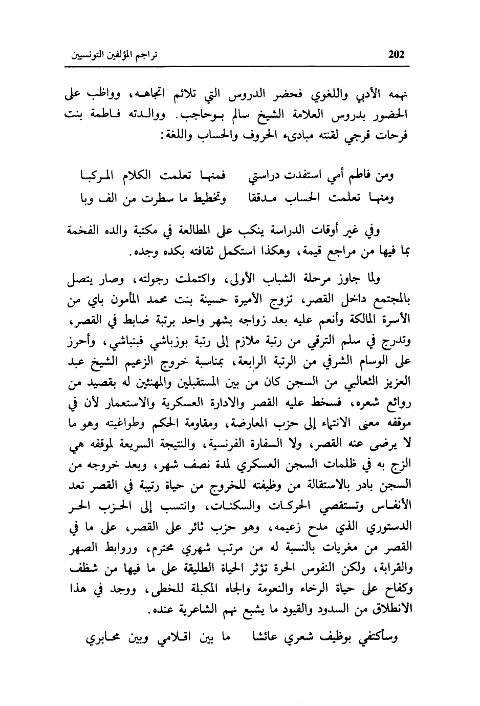 ولما جاوز مرحلة الشباب الأولى، واكتملت رجولته، وصار يتصل بالمجتمع داخل القصر، تزوج الأميرة حسينة بنت محمد المأمون باي من الأسرة المالكة وأنعم عليه بعد زواجه بشهر واحد برتبة ضابط في القصر، وتدرج في سلم الترقي من رتبة ملازم إلى رتبة بوزباشي فبنباشي، وأحرز على الوسام الشرفي من الرتبة الرابعة، بمناسبة خروج الزعيم الشيخ عبد العزيز الثعالبي من السجن كان من بين المستقبلين والمهنئين له بقصيد من روائع شعره، فسخط عليه القصر والادارة العسكرية والاستعمار لأن في موقفه معنى الانتماء إلى حزب المعارضة، ومقاومة الحكم وطواغيته وهو ما لا يرضى عنه القصر، ولا السفارة الفرنسية، والنتيجة السريعة لموقفه هي الزج به في ظلمات السجن العسكري لمدة نصف شهر، وبعد خروجه من السجن بادر بالاستقالة من وظيفته للخروج من حياة رتيبة في القصر تعد الأنفاس وتستقصي الحركات والسكنات، وانتسب إلى الحزب الحر الدستوري الذي مدح زعيمه، وهو حزب ثائر على القصر، على ما في القصر من مغريات بالنسبة له من مرتب شهري محترم، وروابط الصهر والقرابة، ولكن النفوس الحرة تؤثر الحياة الطليقة على ما فيها من شظف وكفاح على حياة الرخاء والنعومة والجاه المكبلة للخطى، ووجد في هذا الانطلاق من السدود والقيود ما يشبع نهم الشاعرية عنده.