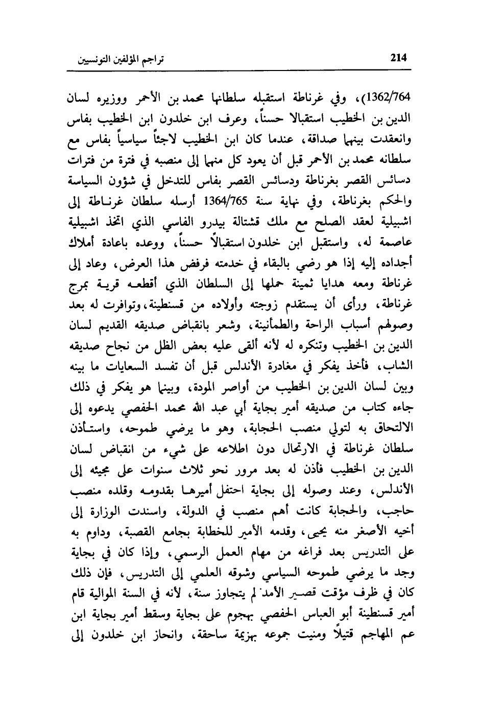764/ 1362)، وفي غرناطة استقبله سلطانها محمد بن الأحمر ووزيره لسان الدين بن الخطيب استقبالا حسنا، وعرف ابن خلدون ابن الخطيب بفاس وانعقدت بينهما صداقة، عند ما كان ابن الخطيب لاجئا سياسيا بفاس مع سلطانه محمد بن الأحمر قبل أن يعود كل منهما إلى منصبه في فترة من فترات دسائس القصر بغرناطة ودسائس القصر بفاس للتدخل في شؤون السياسة والحكم بغرناطة، وفي نهاية سنة 765/ 1364 أرسله سلطان غرناطة إلى اشبيلية لعقد الصلح مع ملك قشتالة بيدرو الفاسي الذي اتخذ اشبيلية عاصمة له، واستقبل ابن خلدون استقبالا حسنا، ووعده باعادة أملاك أجداده إليه إذا هو رضي بالبقاء في خدمته فرفض هذا العرض، وعاد إلى غرناطة ومعه هدايا ثمينة حملها إلى السلطان الذي أقطعه قرية بمرج غرناطة، ورأى أن يستقدم زوجته وأولاده من قسنطينة، وتوافرت له بعد وصولهم أسباب الراحة والطمأنينة، وشعر بانقباض صديقه القديم لسان الدين بن الخطيب وتنكره له لأنه ألقى عليه بعض الظل من نجاح صديقه الشاب، فأخذ يفكر في مغادرة الأندلس قبل أن تفسد السعايات ما بينه وبين لسان الدين بن الخطيب من أواصر المودة، وبينما هو يفكر في ذلك جاءه كتاب من صديقه أمير بجاية أبي عبد الله محمد الحفصي يدعوه إلى الالتحاق به لتولي منصب الحجابة، وهو ما يرضي طموحه، واستأذن سلطان غرناطة في الارتحال دون اطلاعه على شيء من انقباض لسان الدين بن الخطيب فأذن له بعد مرور نحو ثلاث سنوات على مجيئه إلى الأندلس، وعند وصوله إلى بجاية احتفل أميرها بقدومه وقلده منصب حاجب، والحجابة كانت أهم منصب في الدولة، واسندت الوزارة إلى أخيه الأصغر منه يحيى، وقدمه الأمير للخطابة بجامع القصبة، وداوم به على التدريس بعد فراغه من مهام العمل الرسمي، وإذا كان في بجاية وجد ما يرضي طموحه السياسي وشوقه العلمي إلى التدريس، فإن ذلك كان في ظرف مؤقت قصير الأمد لم يتجاوز سنة، لأنه في السنة الموالية قام أمير قسنطينة أبو العباس الحفصي بهجوم على بجاية وسقط أمير بجاية ابن عم المهاجم قتيلا ومنيت جموعه بهزيمة ساحقة، وانحاز ابن خلدون إلى