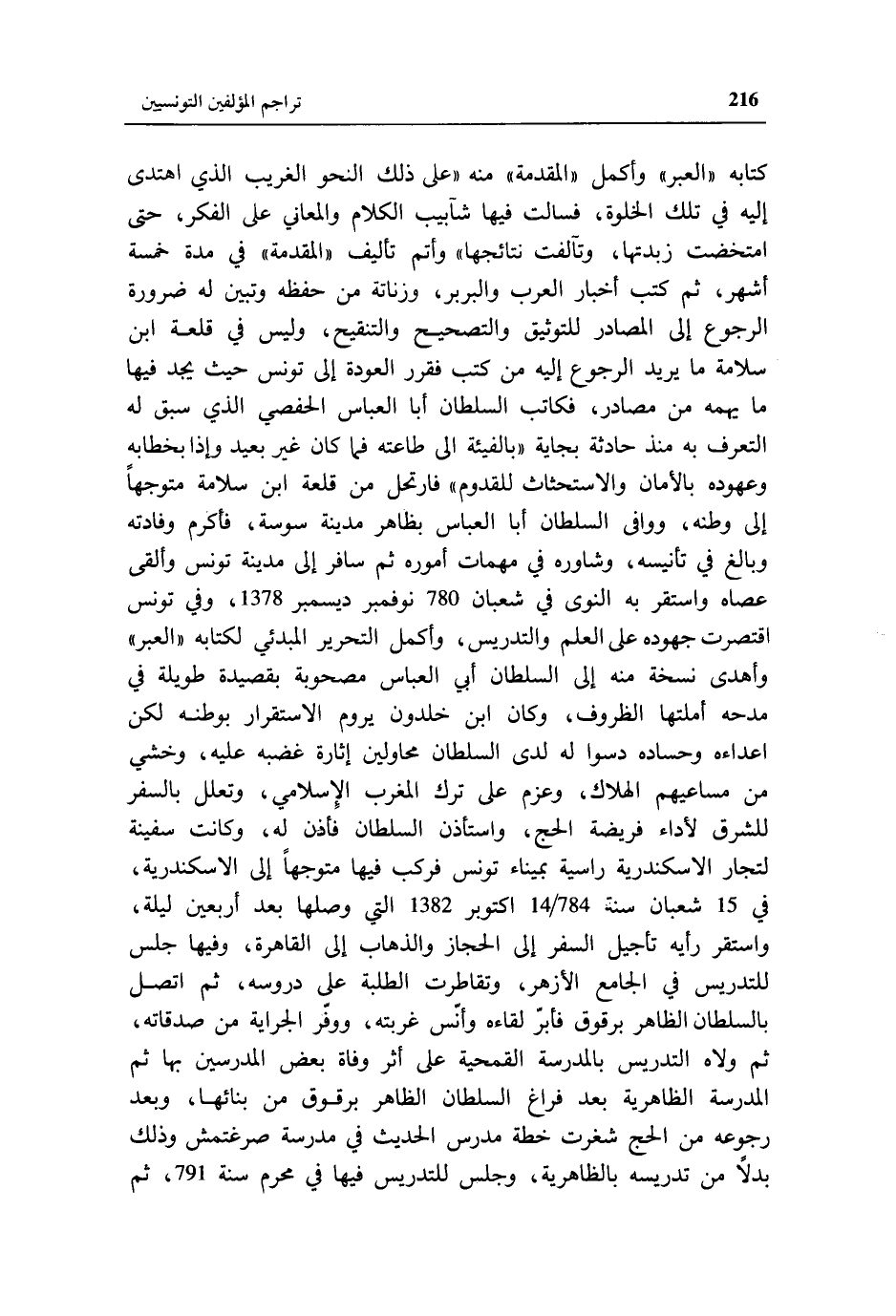 كتابه «العبر» وأكمل «المقدمة» منه «على ذلك النحو الغريب الذي اهتدى إليه في تلك الخلوة، فسالت فيها شآبيب الكلام والمعاني على الفكر، حتى امتخضت زبدتها، وتآلفت نتائجها» وأتم تأليف «المقدمة» في مدة خمسة أشهر، ثم كتب أخبار العرب والبربر، وزناتة من حفظه وتبين له ضرورة الرجوع إلى المصادر للتوثيق والتصحيح والتنقيح، وليس في قلعة ابن سلامة ما يريد الرجوع إليه من كتب فقرر العودة إلى تونس حيث يجد فيها ما يهمه من مصادر، فكاتب السلطان أبا العباس الحفصي الذي سبق له التعرف به منذ حادثة بجاية «بالفيئة الى طاعته فما كان غير بعيد وإذا بخطابه وعهوده بالأمان والاستحثاث للقدوم» فارتحل من قلعة ابن سلامة متوجها إلى وطنه، ووافى السلطان أبا العباس بظاهر مدينة سوسة، فأكرم وفادته وبالغ في تأنيسه، وشاوره في مهمات أموره ثم سافر إلى مدينة تونس وألقى عصاه واستقر به النوى في شعبان 780 نوفمبر ديسمبر 1378، وفي تونس اقتصرت جهوده على العلم والتدريس، وأكمل التحرير المبدئي لكتابه «العبر» وأهدى نسخة منه إلى السلطان أبي العباس مصحوبة بقصيدة طويلة في مدحه أملتها الظروف، وكان ابن خلدون يروم الاستقرار بوطنه لكن اعداءه وحساده دسوا له لدى السلطان محاولين إثارة غضبه عليه، وخشي من مساعيهم الهلاك، وعزم على ترك المغرب الإسلامي، وتعلل بالسفر للشرق لأداء فريضة الحج، واستأذن السلطان فأذن له، وكانت سفينة لتجار الاسكندرية راسية بميناء تونس فركب فيها متوجها إلى الاسكندرية، في 15 شعبان سنة 784/ 14 اكتوبر 1382 التي وصلها بعد أربعين ليلة، واستقر رأيه تأجيل السفر إلى الحجاز والذهاب إلى القاهرة، وفيها جلس للتدريس في الجامع الأزهر، وتقاطرت الطلبة على دروسه، ثم اتصل بالسلطان الظاهر برقوق فأبّر لقاءه وأنّس غربته، ووفّر الجراية من صدقاته، ثم ولاه التدريس بالمدرسة القمحية على أثر وفاة بعض المدرسين بها ثم المدرسة الظاهرية بعد فراغ السلطان الظاهر برقوق من بنائها، وبعد رجوعه من الحج شغرت خطة مدرس الحديث في مدرسة صرغتمش وذلك بدلا من تدريسه بالظاهرية، وجلس للتدريس فيها في محرم سنة 791، ثم