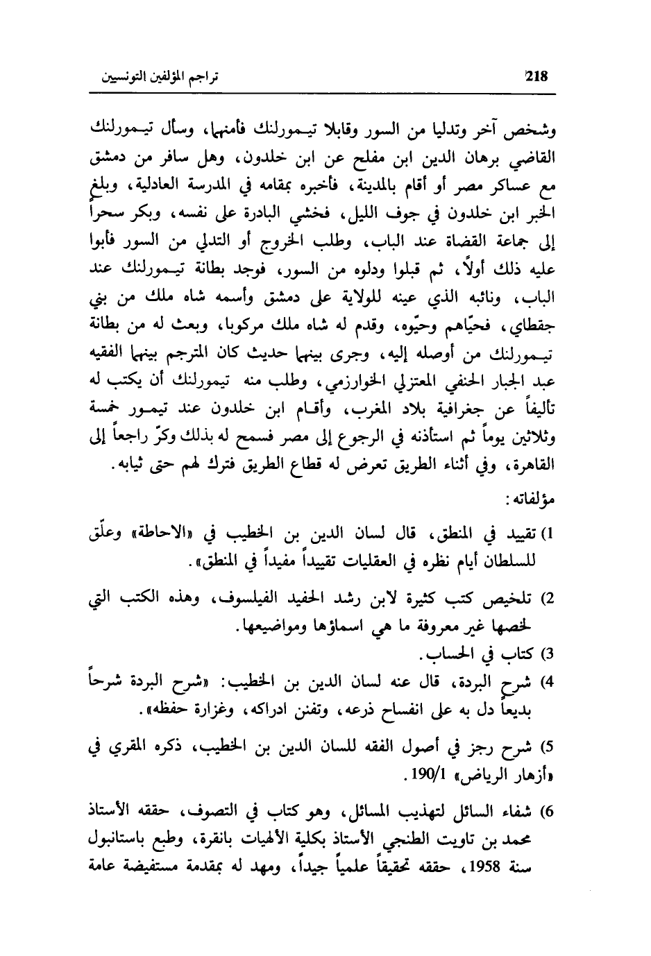 وشخص آخر وتدليا من السور وقابلا تيمور لنك فأمنهما، وسأل تيمور لنك القاضي برهان الدين ابن مفلح عن ابن خلدون، وهل سافر من دمشق مع عساكر مصر أو أقام بالمدينة، فأخبره بمقامه في المدرسة العادلية، وبلغ الخبر ابن خلدون في جوف الليل، فخشي البادرة على نفسه، وبكر سحرا إلى جماعة القضاة عند الباب، وطلب الخروج أو التدلي من السور فأبوا عليه ذلك أولا، ثم قبلوا ودلوه من السور، فوجد بطانة تيمور لنك عند الباب، ونائبه الذي عينه للولاية على دمشق وأسمه شاه ملك من بني جقطاي، فحيّاهم وحيّوه، وقدم له شاه ملك مركوبا، وبعث له من بطانة تيمور لنك من أوصله إليه، وجرى بينهما حديث كان المترجم بينهما الفقيه عبد الجبار الحنفي المعتزلي الخوارزمي، وطلب منه تيمور لنك أن يكتب له تأليفا عن جغرافية بلاد المغرب، وأقام ابن خلدون عند تيمور خمسة وثلاثين يوما ثم استأذنه في الرجوع إلى مصر فسمح له بذلك وكرّ راجعا إلى القاهرة، وفي أثناء الطريق تعرض له قطاع الطريق فترك لهم حتى ثيابه.