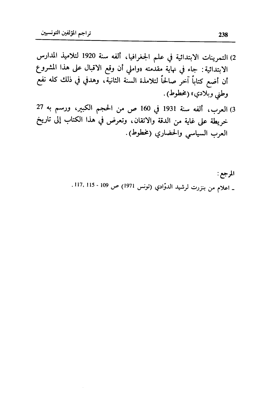 3) العرب، ألفه سنة 1931 في 160 ص من الحجم الكبير، ورسم به 27 خريطة على غاية من الدقة والاتقان، وتعرض في هذا الكتاب إلى تاريخ العرب السياسي والحضاري (مخطوط).
