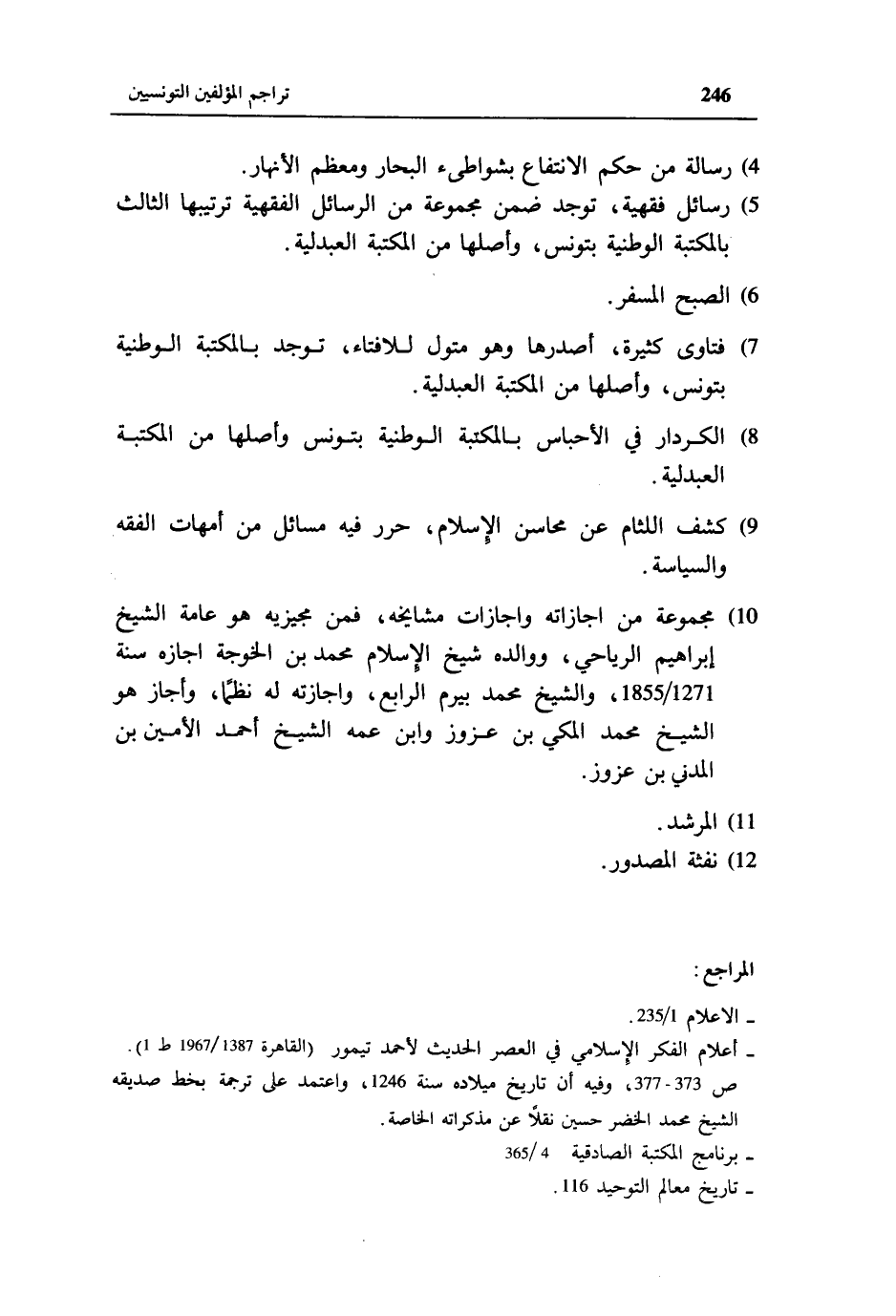 10) مجموعة من اجازاته واجازات مشايخه، فمن مجيزيه هو عامة الشيخ إبراهيم الرياحي، ووالده شيخ الإسلام محمد بن الخوجة اجازه سنة 1271/ 1855، والشيخ محمد بيرم الرابع، واجازته له نظما، وأجاز هو الشيخ محمد المكي بن عزوز وابن عمه الشيخ أحمد الأمين بن المدني بن عزوز.