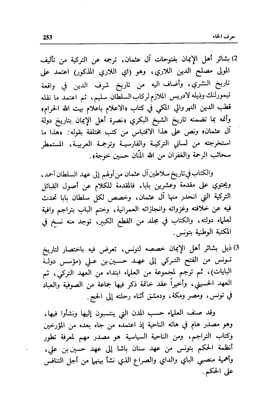 3) ذيل بشائر أهل الإيمان خصصه لتونس، تعرض فيه باختصار لتاريخ تونس من الفتح التركي إلى عهد حسين بن علي (مؤسس دولة البايات)، ثم ترجم لمجموعة من العلماء ابتداء من العهد التركي، ثم العهد الحسيني، وأخيرا عقد خاتمة ذكر فيها جماعة من الصوفية والعباد في تونس، ومصر ومكة، ودمشق أثناء رحلته إلى الحج.